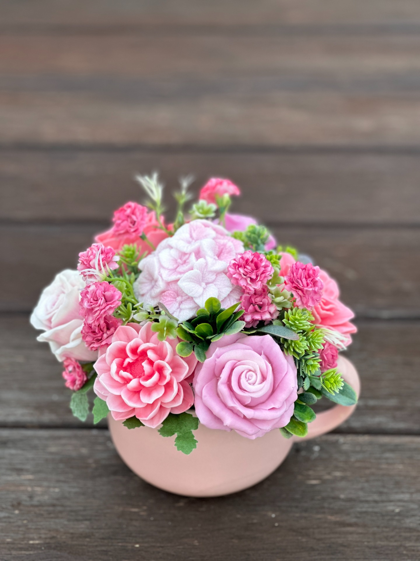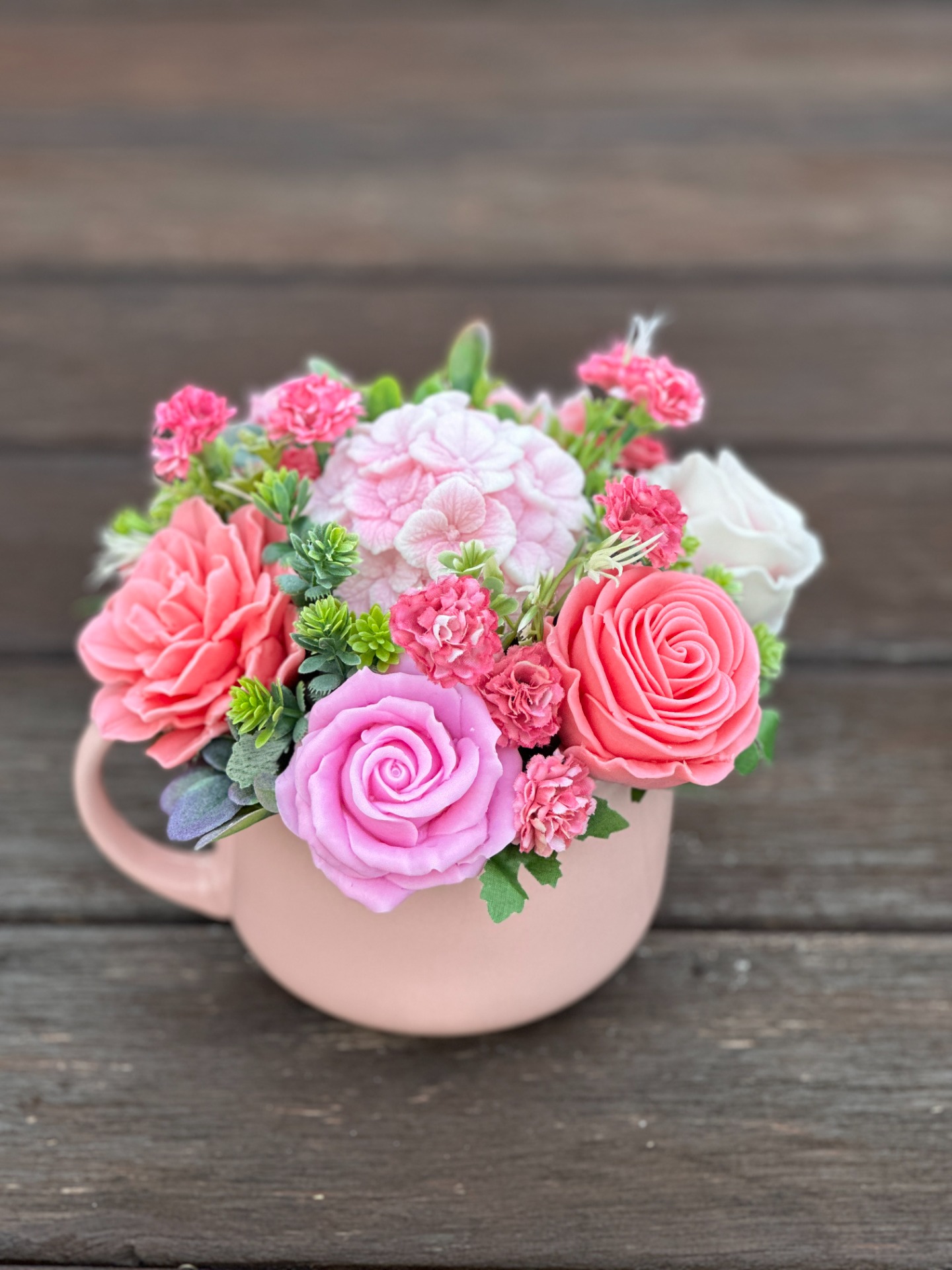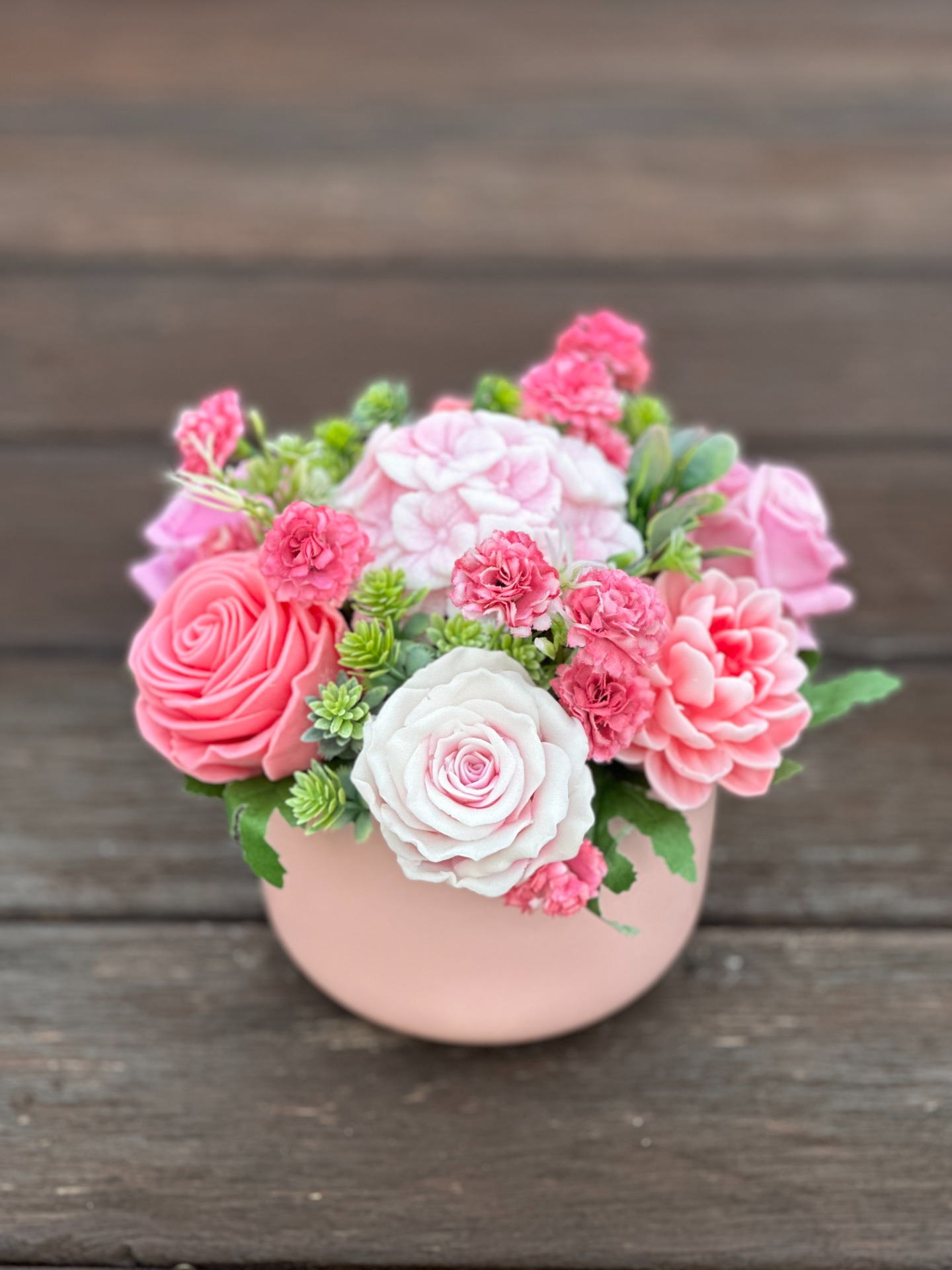 Dekorační mýdlová kytice : ručně vyrobené mýdlové květiny s jemnou květinovou vůní, kombinace s umělými květy, v keramickém hrnku