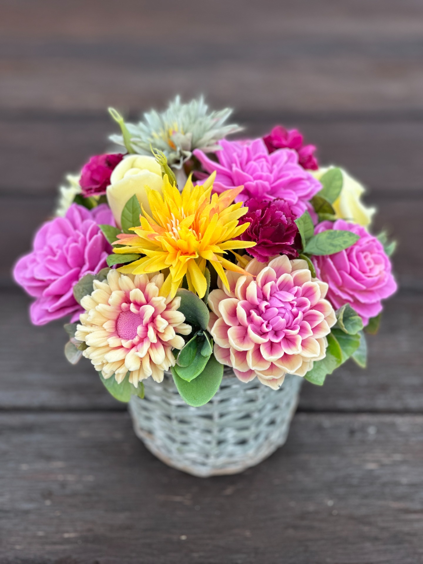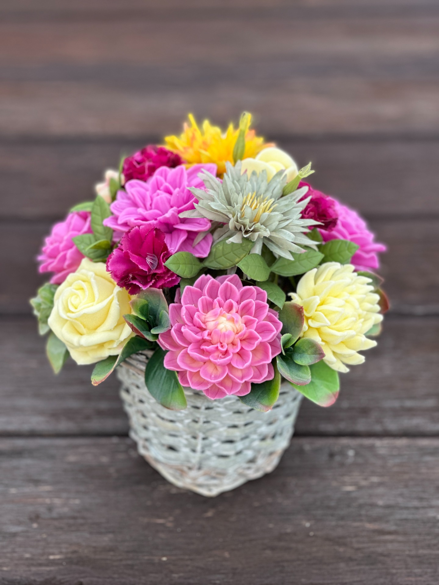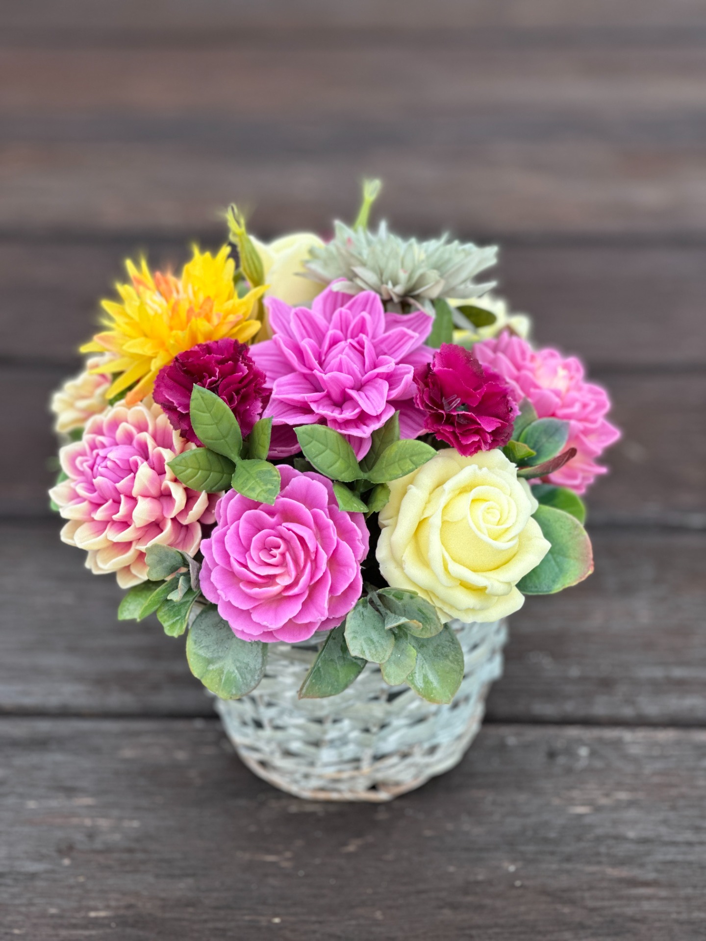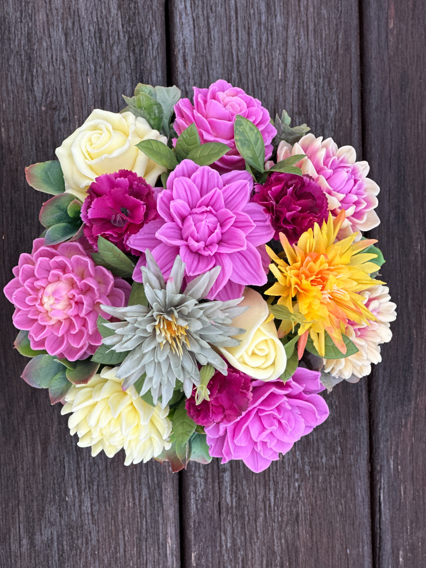 Dekorační mýdlová kytice s jemnou květinovou vůní, dodekorováno umělými rostlinami, v plechovém obalu