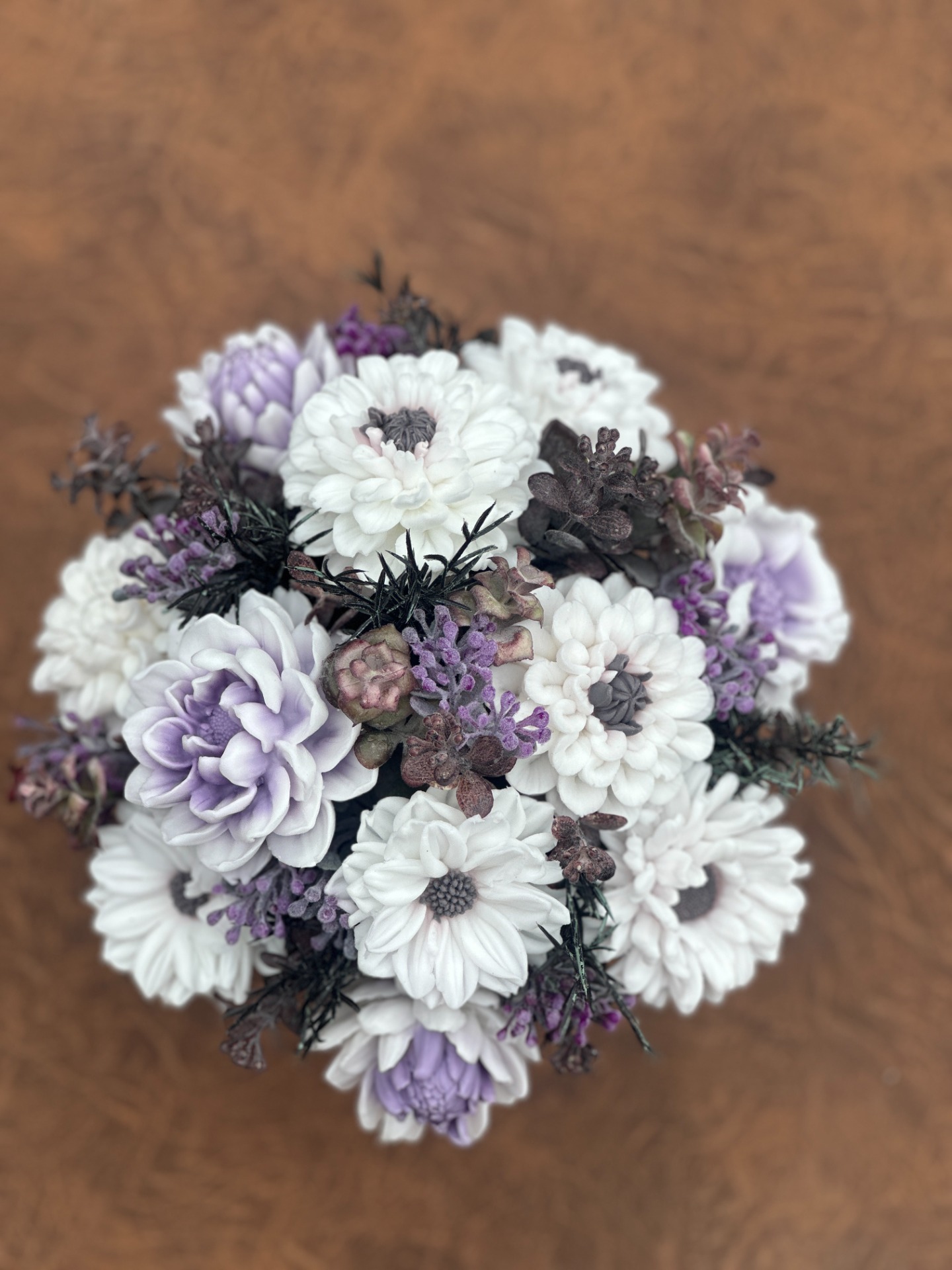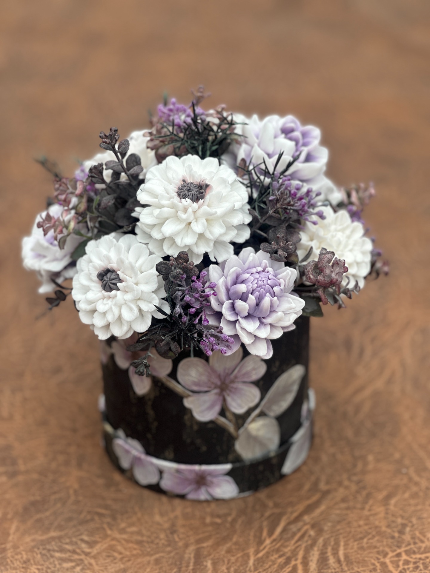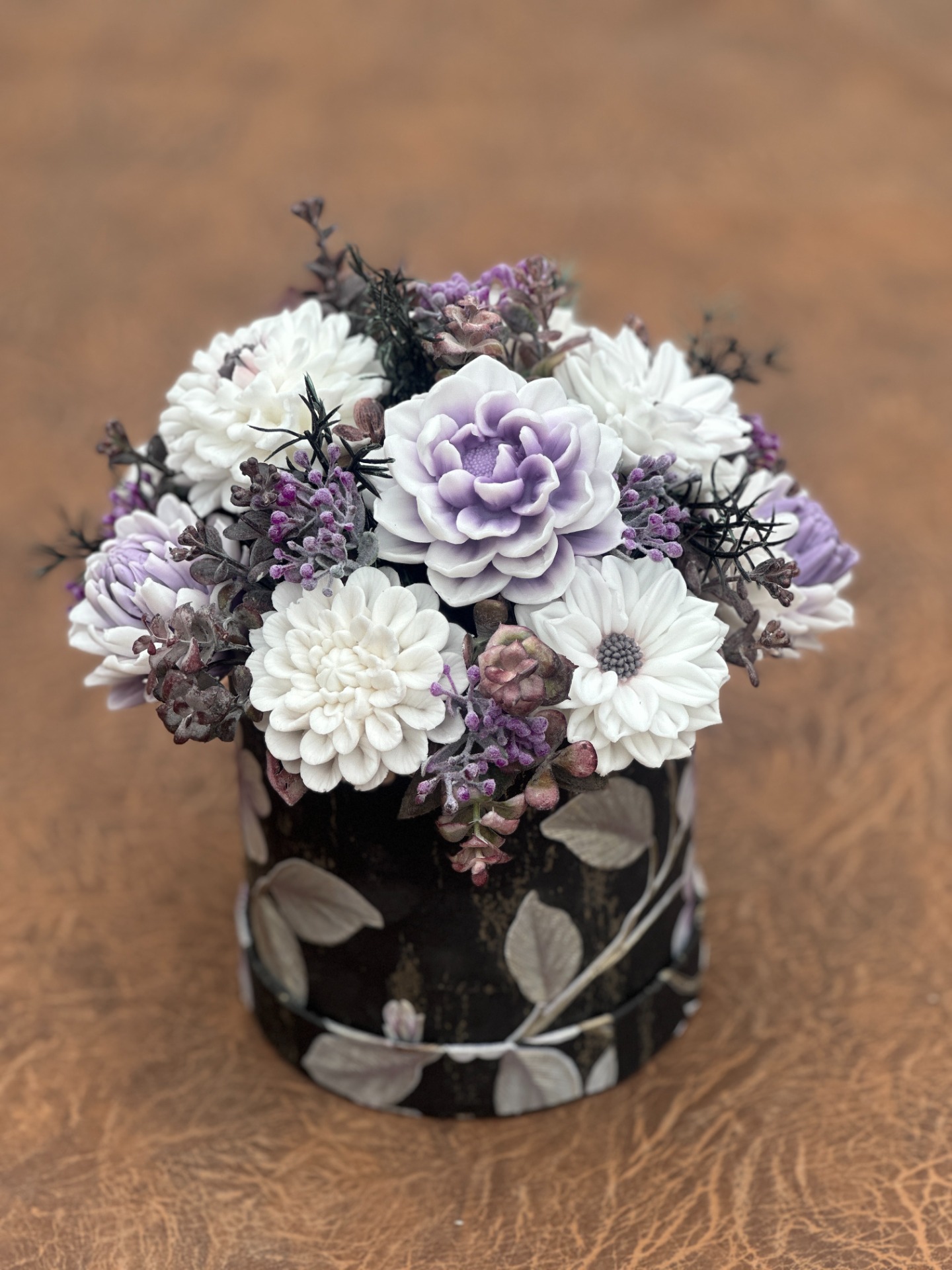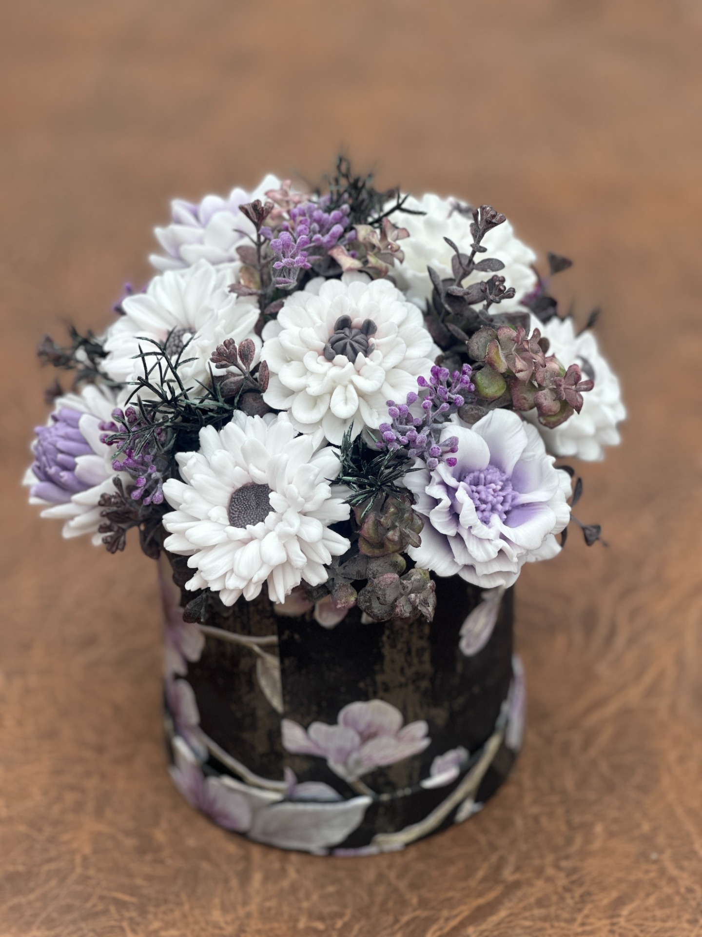 dekorační mýdlová kytice - ručně vyrobené mýdlové květiny s příjemnou květinovou vůní, dodekorováno umělými rostlinami, papírový flower box