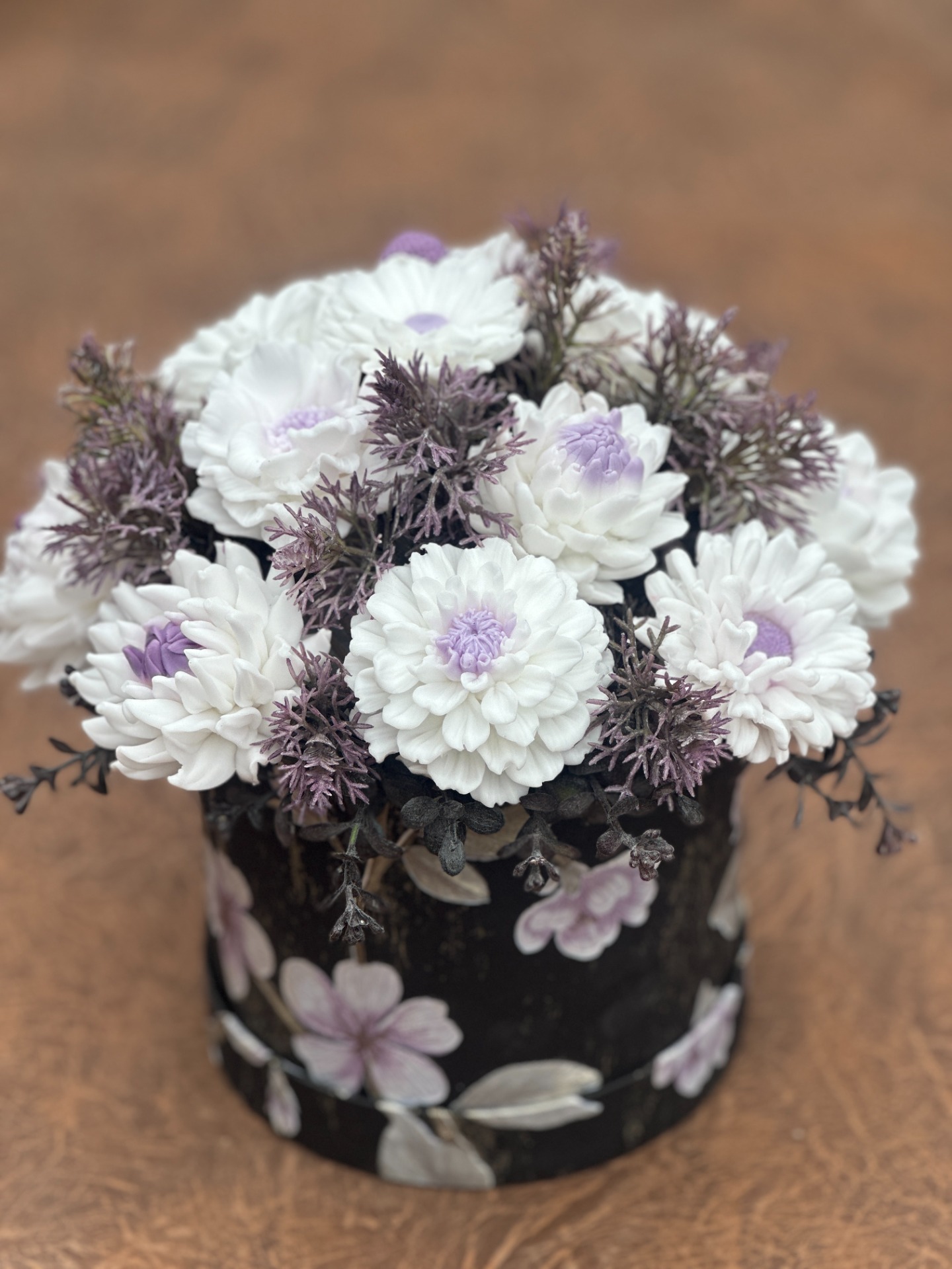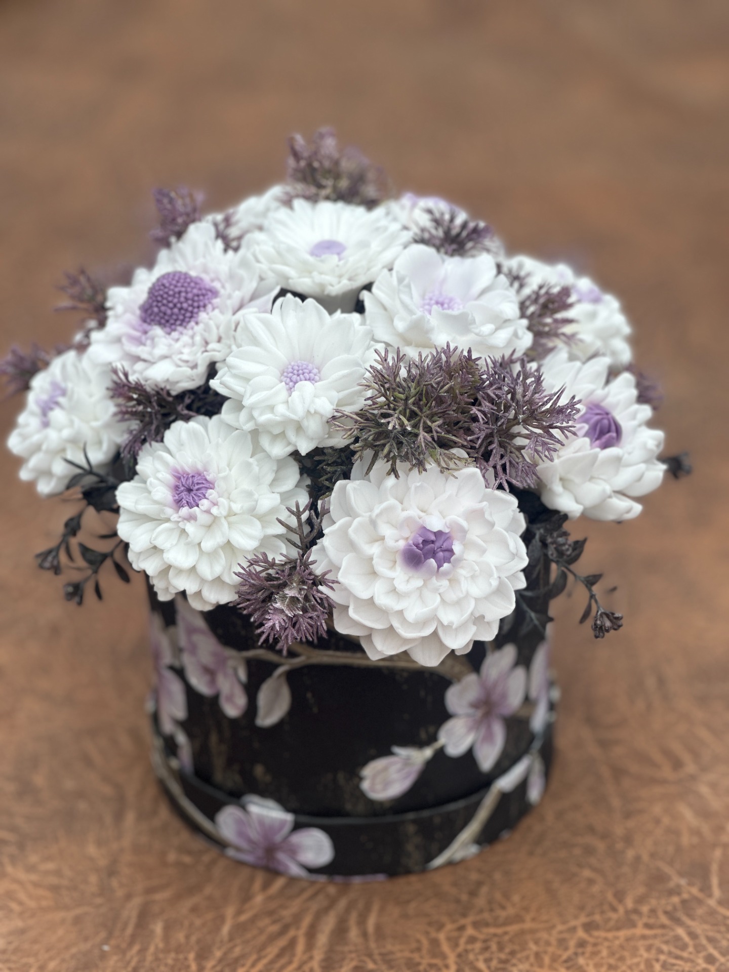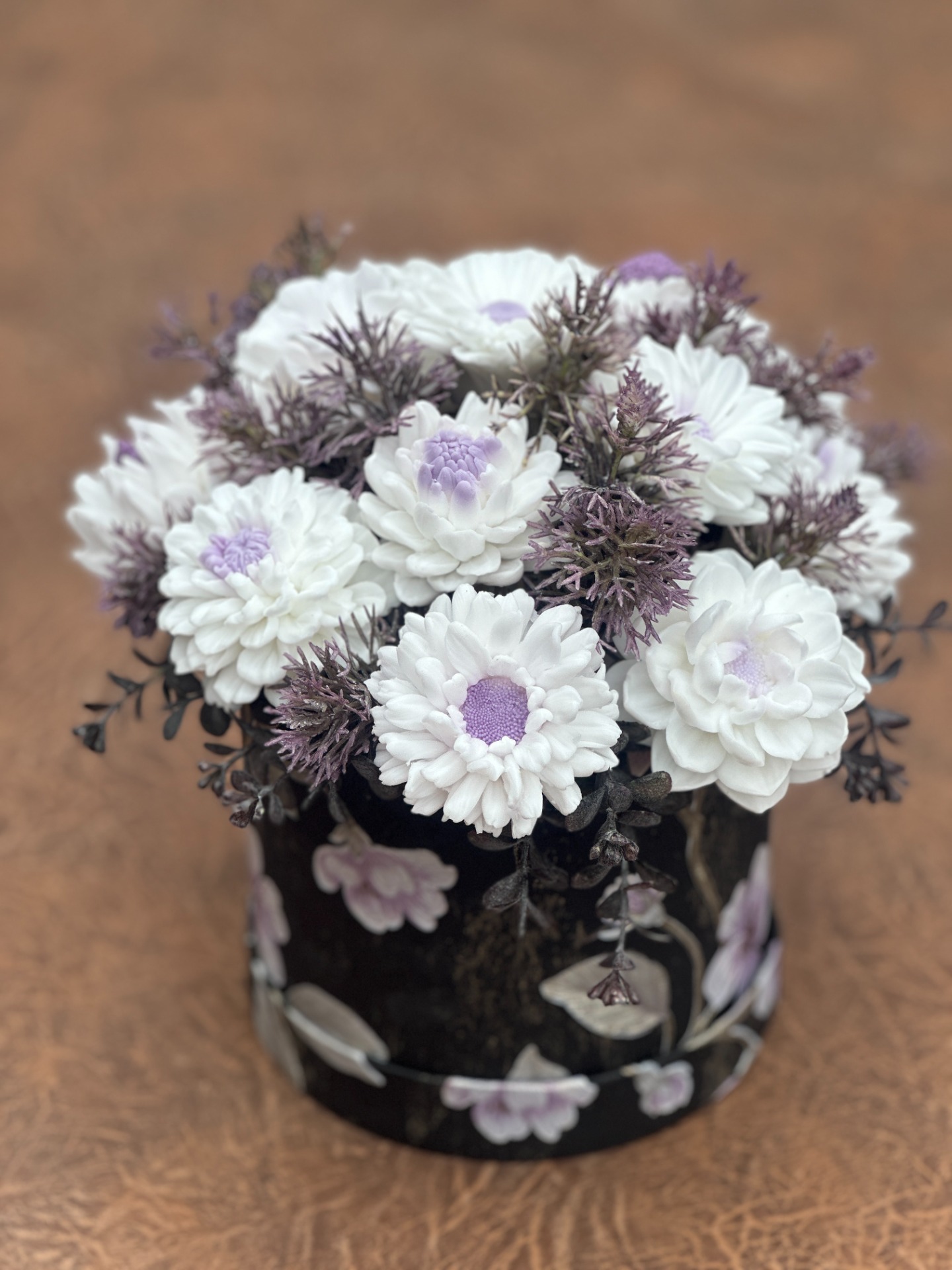 dekorační mýdlová kytice - ručně vyrobené mýdlové květiny s příjemnou květinovou vůní, dodekorováno umělými rostlinami, papírový flower box,