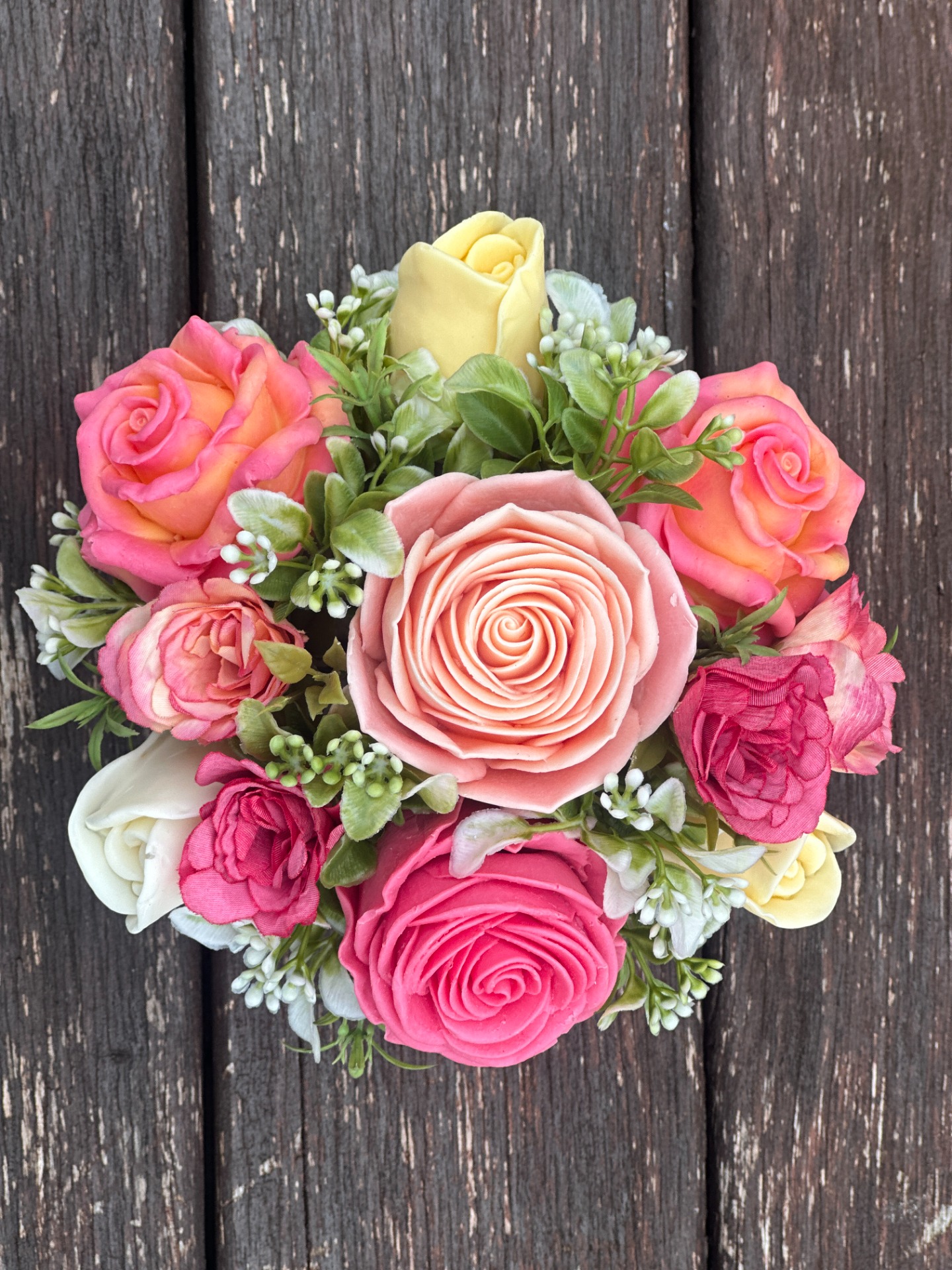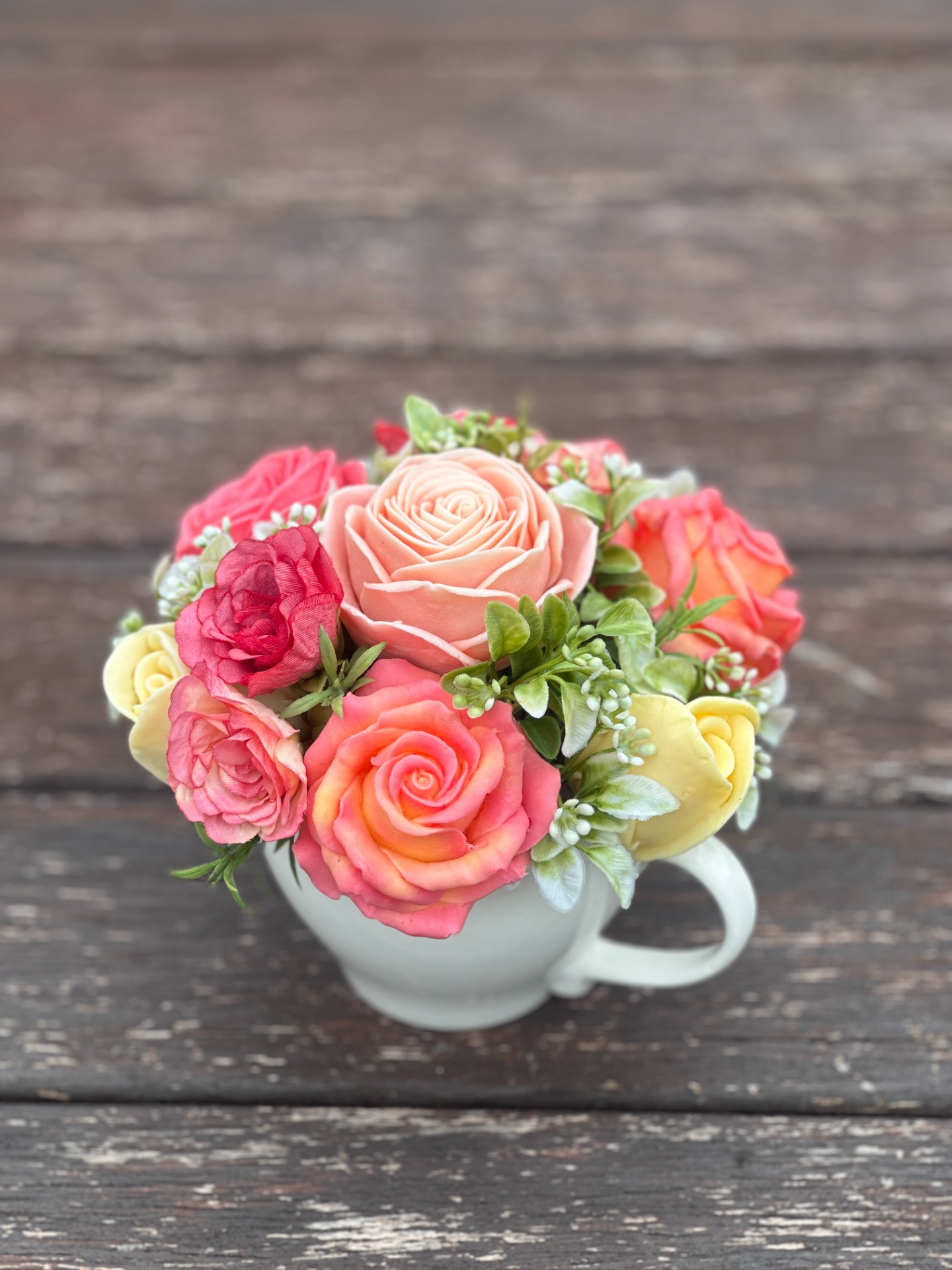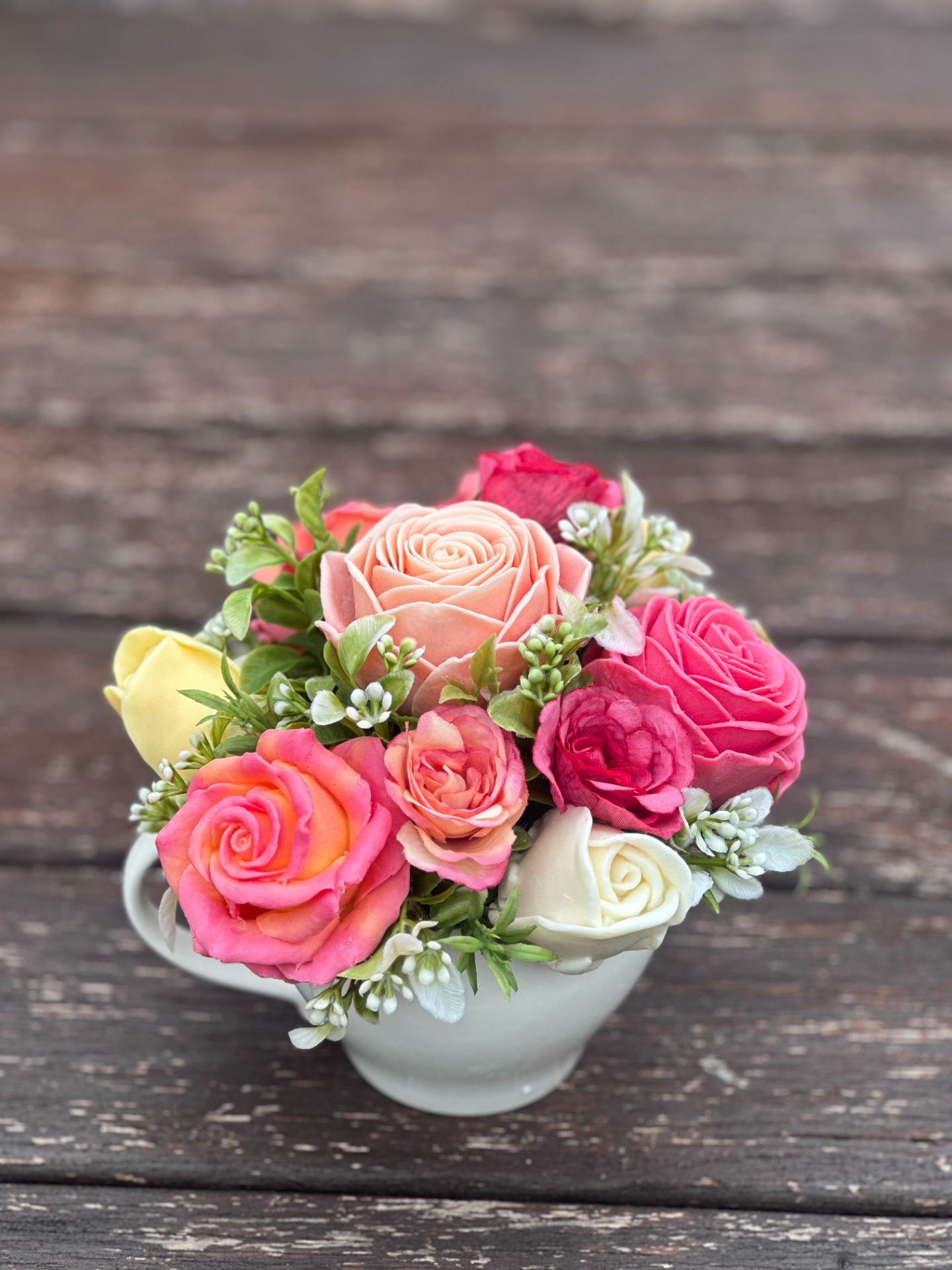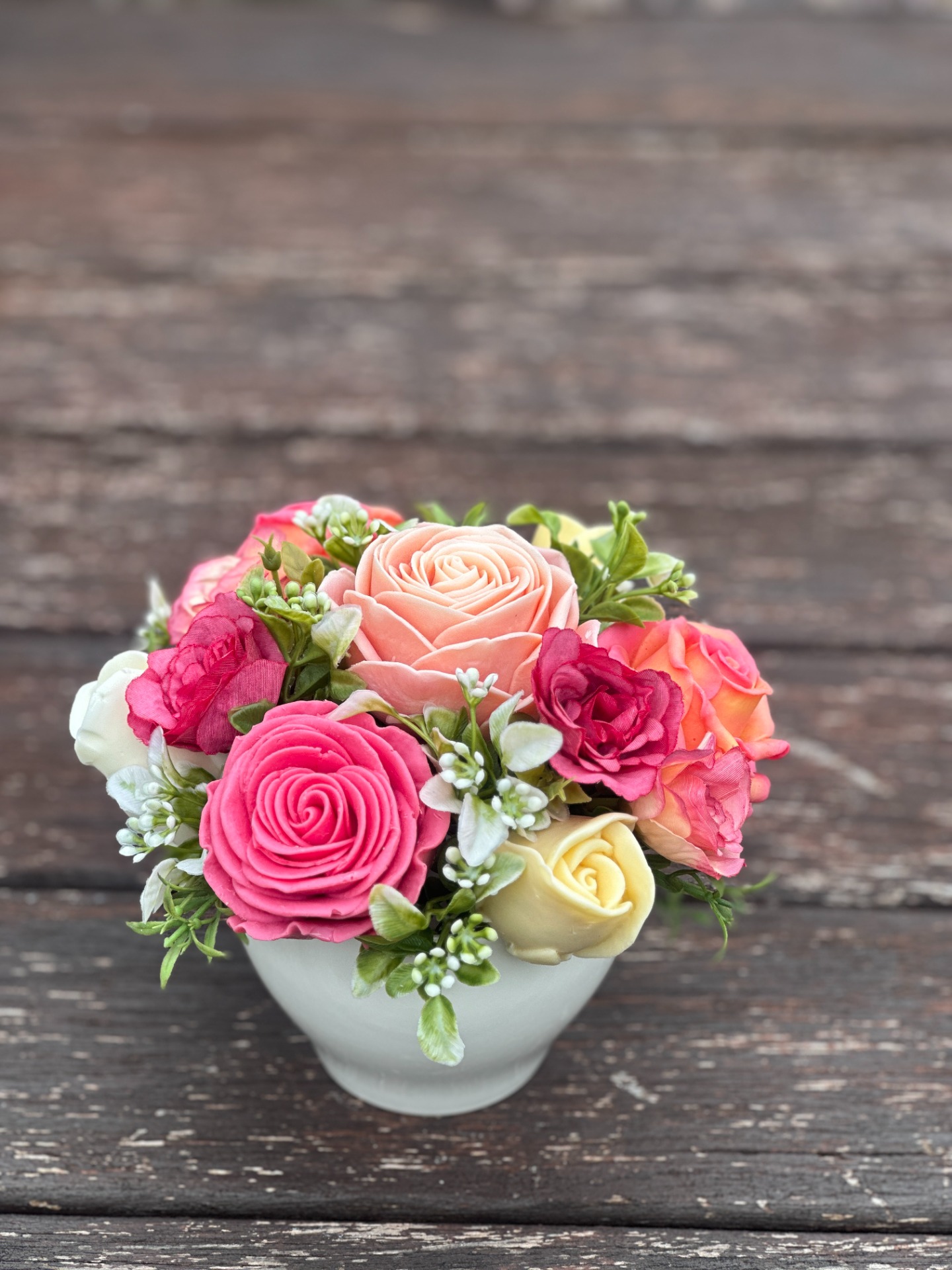 dekorační mýdlová kytice - ručně vyrobené mýdlové květiny s příjemnou květinovou vůní, dodekorováno umělými rostlinami, keramický obal