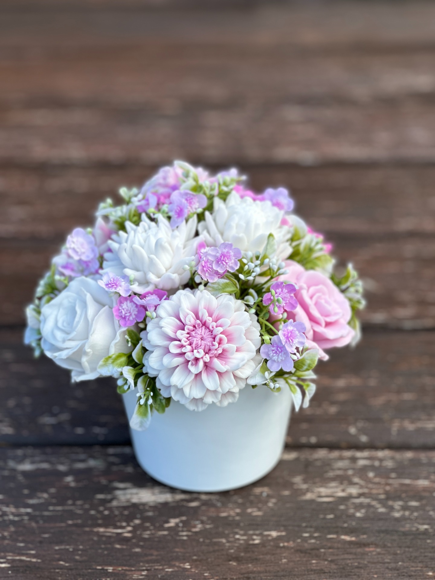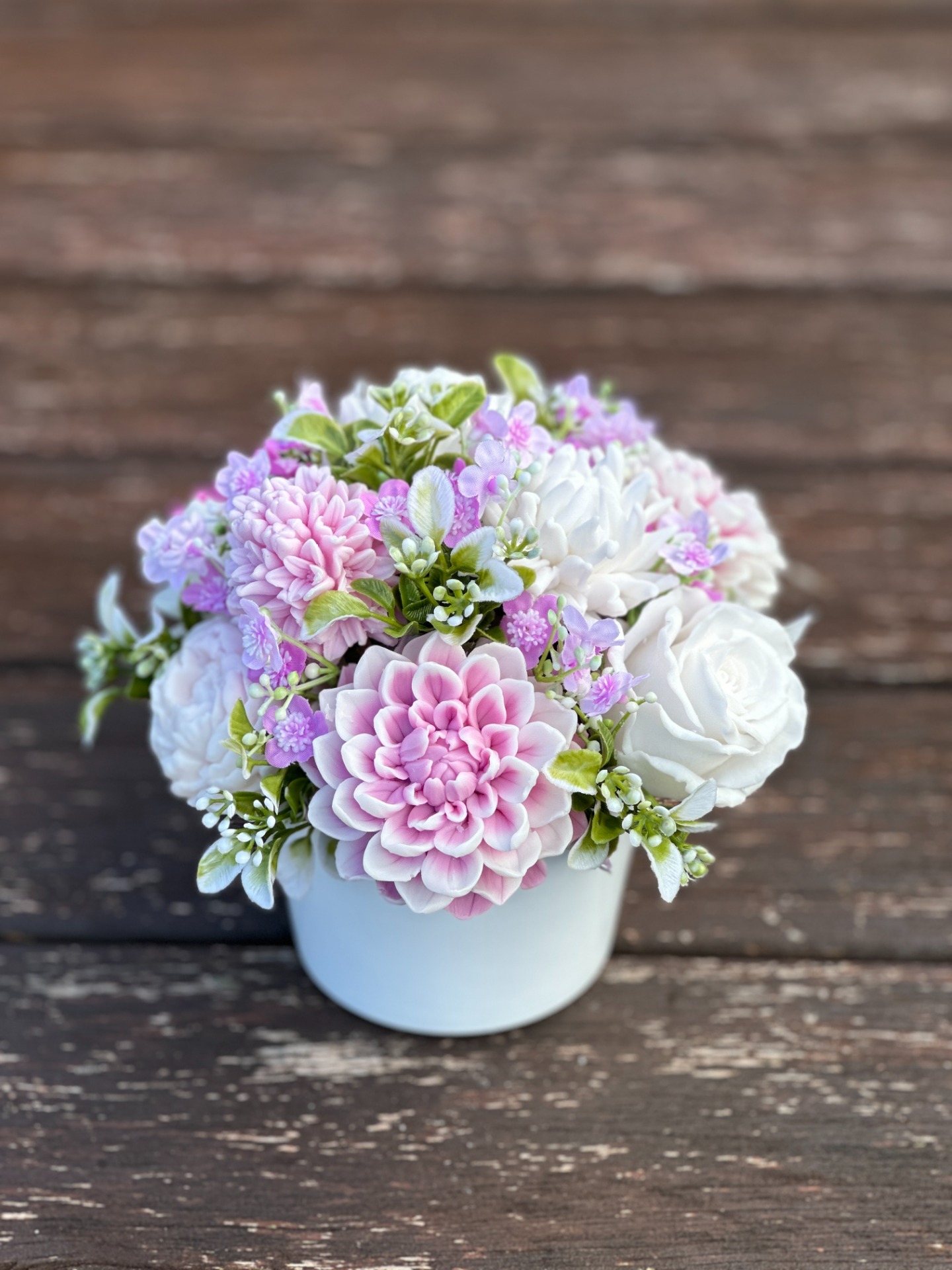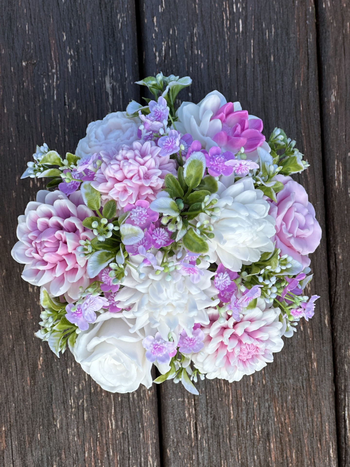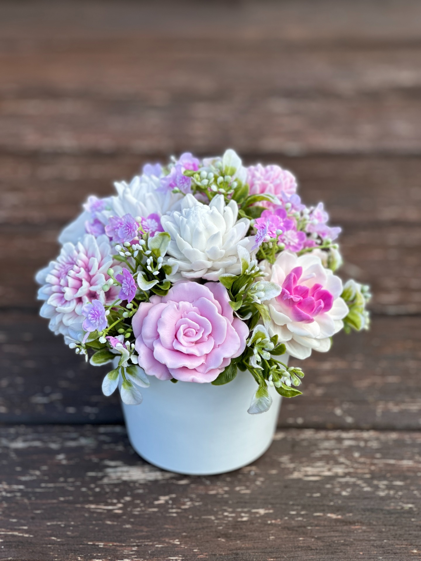 dekorační mýdlová kytice - ručně vyrobené mýdlové květiny s příjemnou květinovou vůní, kombinované s umělými rostlinami, keramický obal