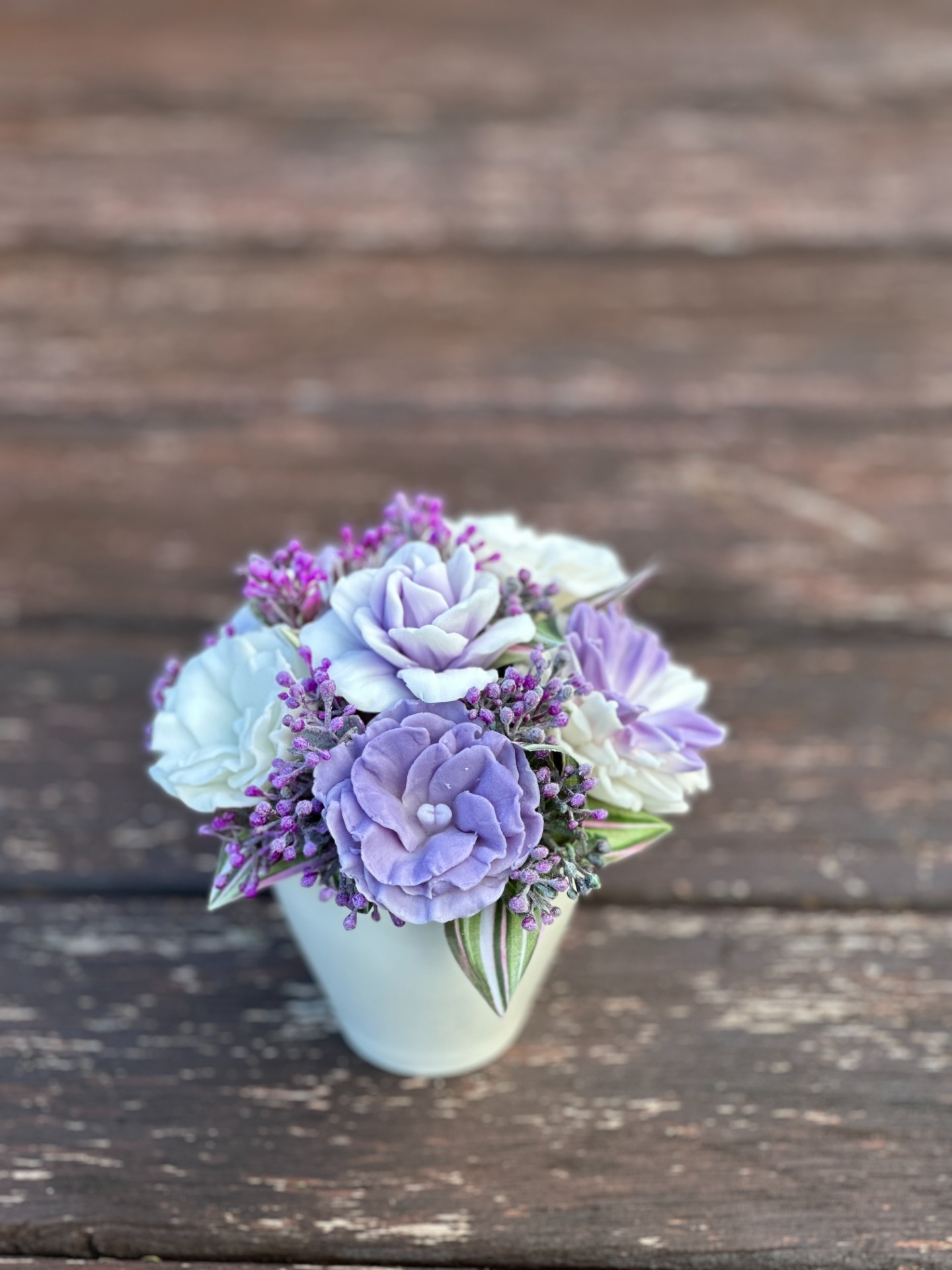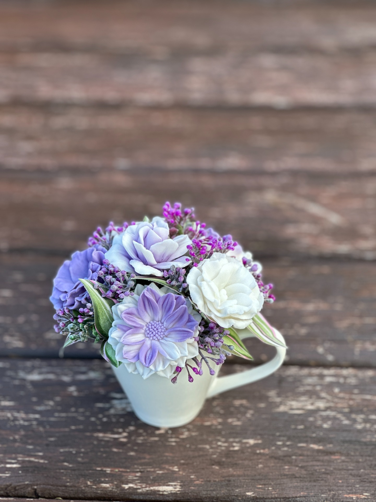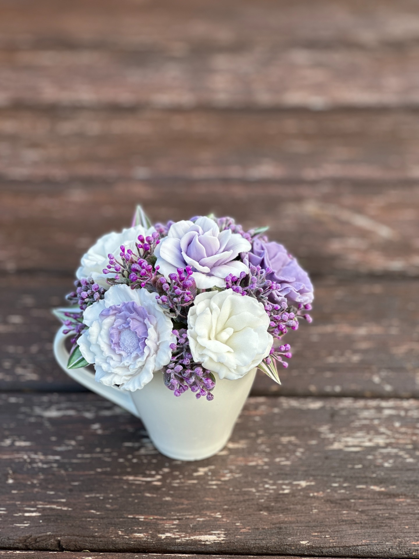 dekorační mýdlová kytice - ručně vyrobené mýdlové květiny s příjemnou květinovou vůní, kombinované s umělými rostlinami, keramický šálek