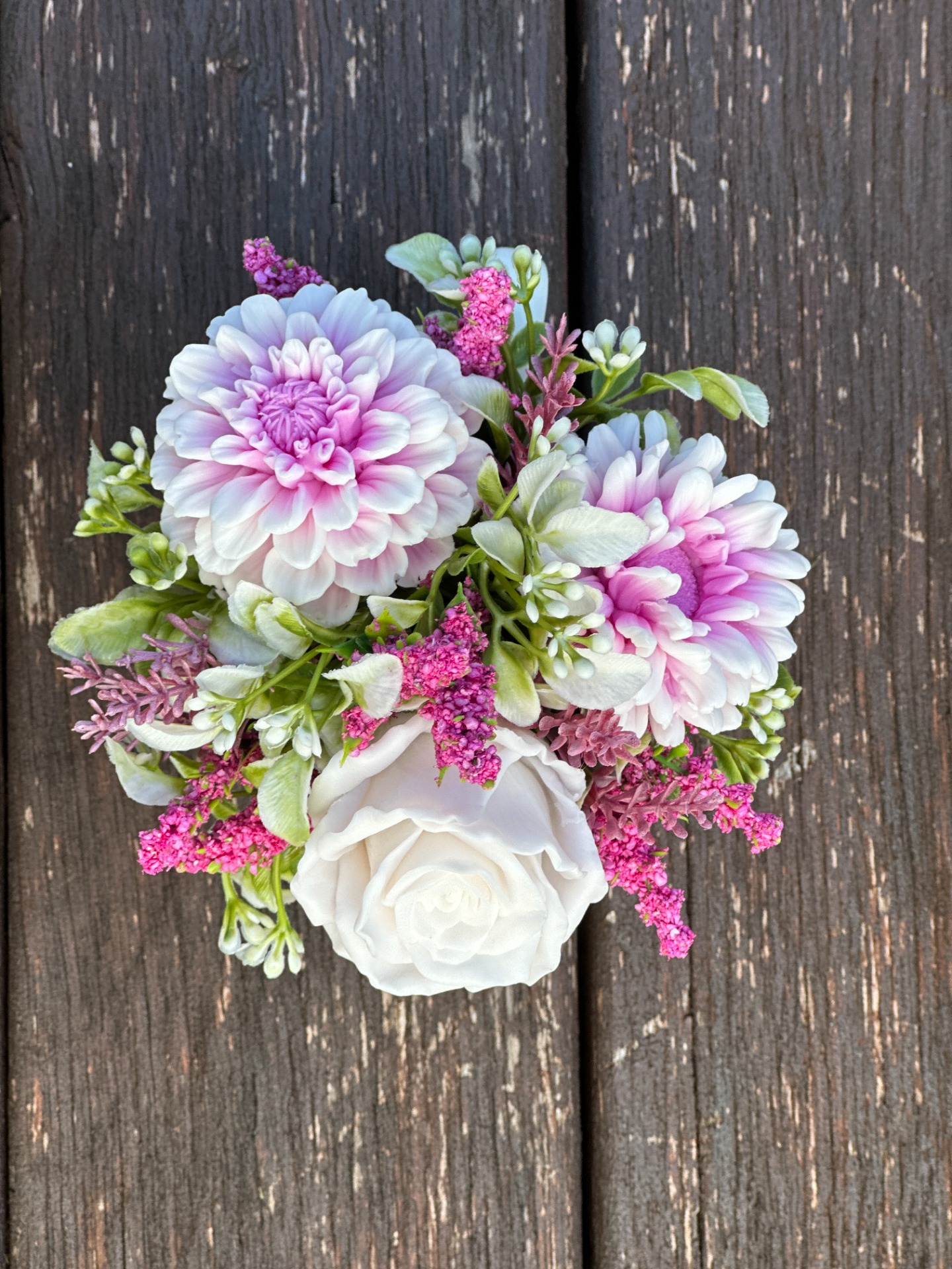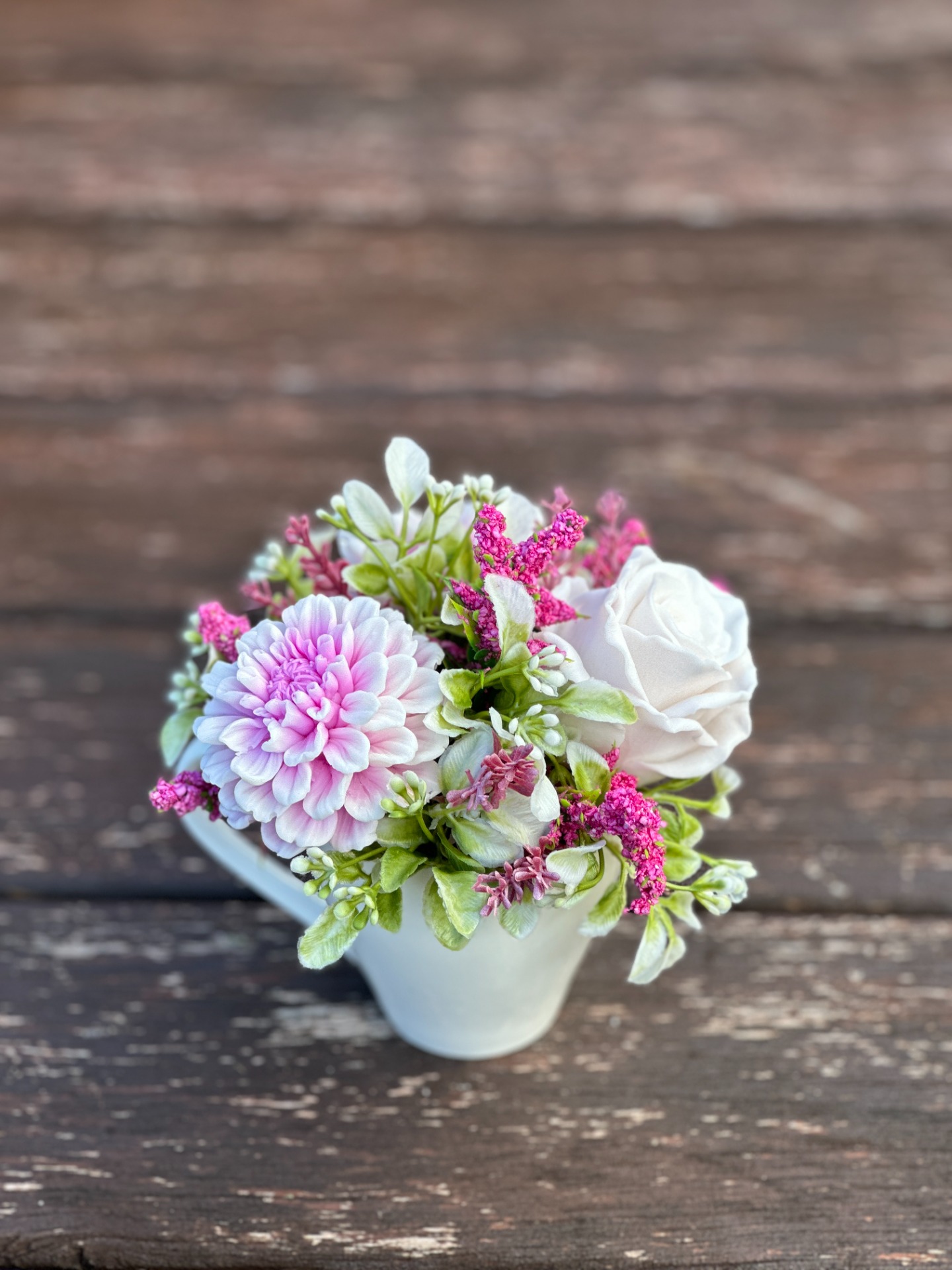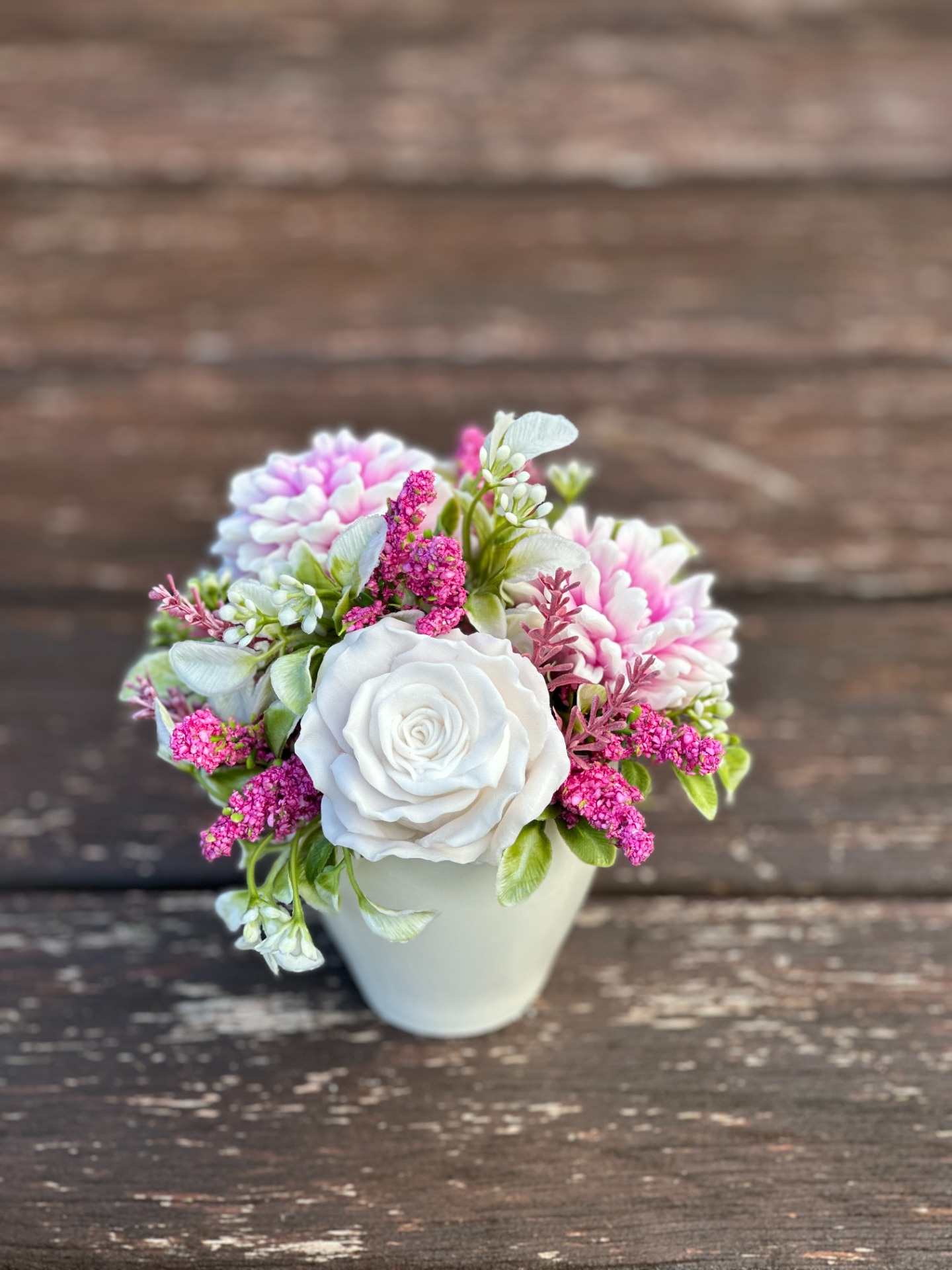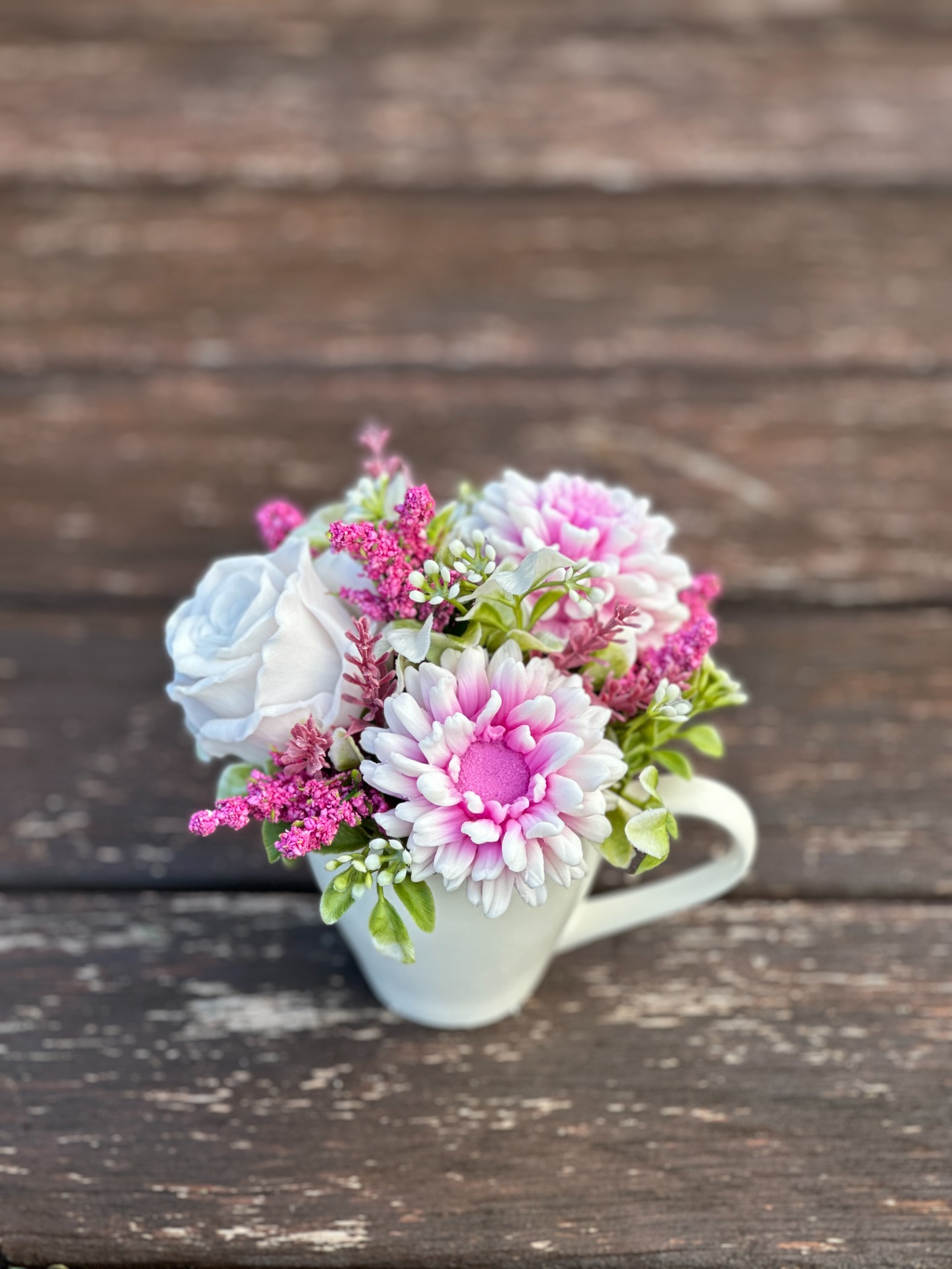 dekorační mýdlová kytice - ručně vyrobené mýdlové květiny s příjemnou květinovou vůní, kombinované s umělými rostlinami, keramický šálek