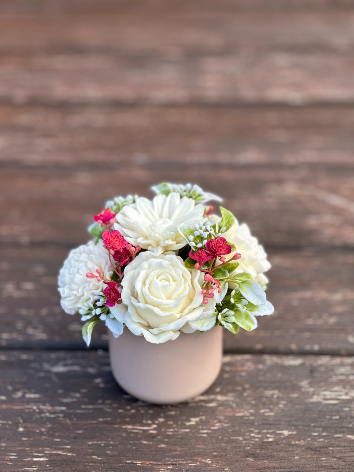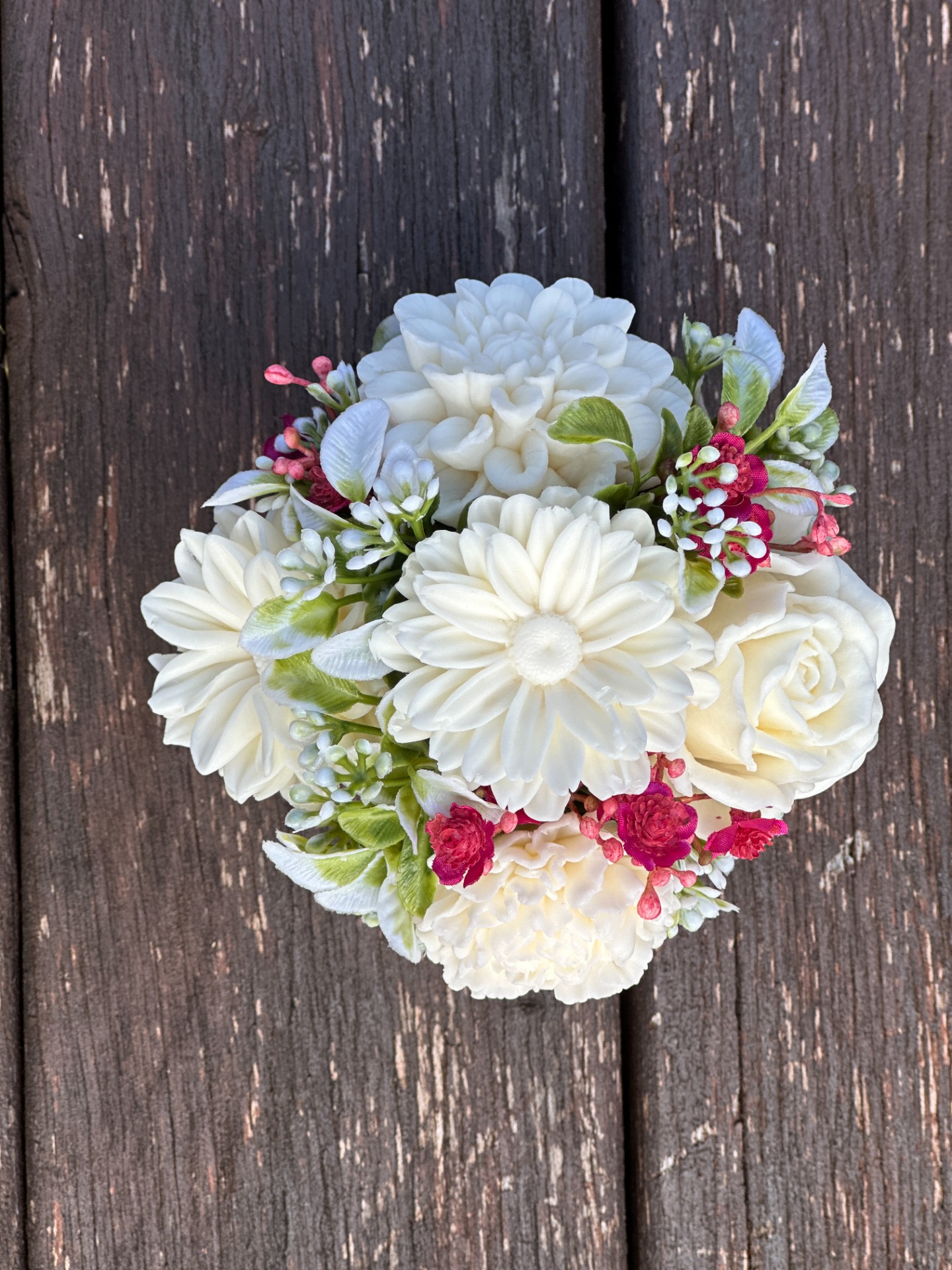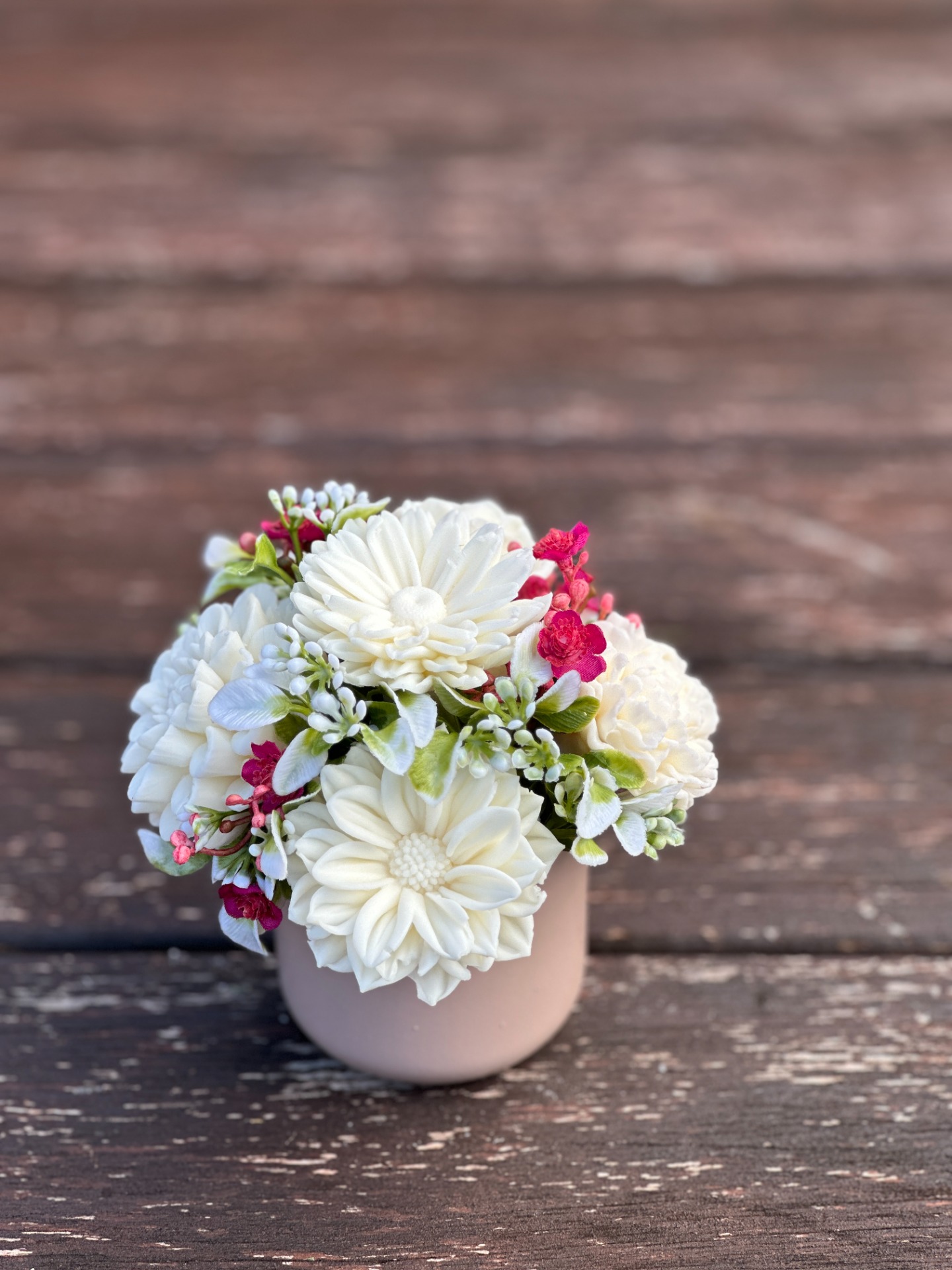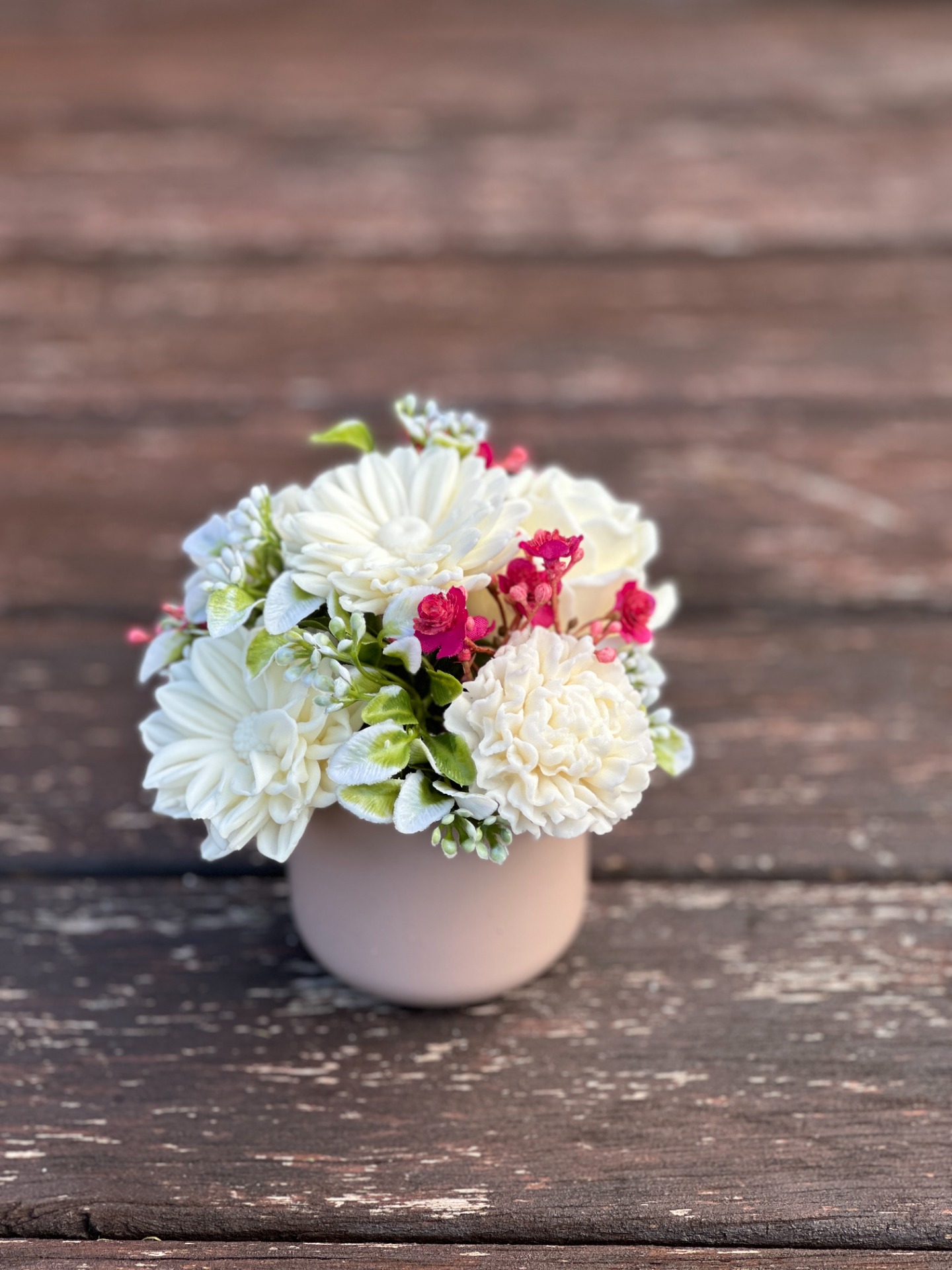 dekorační mýdlová kytice - ručně vyrobené mýdlové květiny s příjemnou květinovou vůní, kombinované s umělými rostlinami, keramický obal