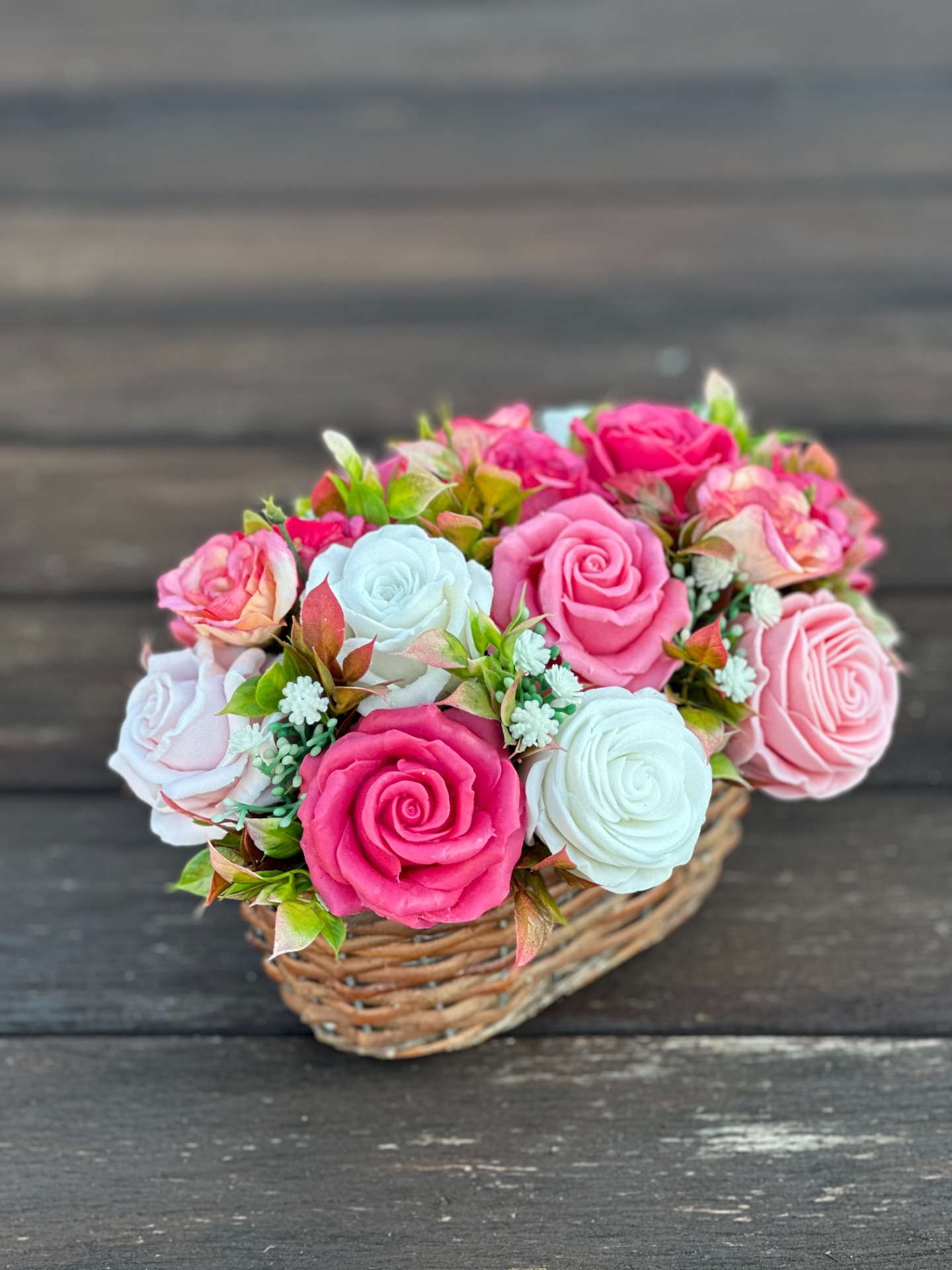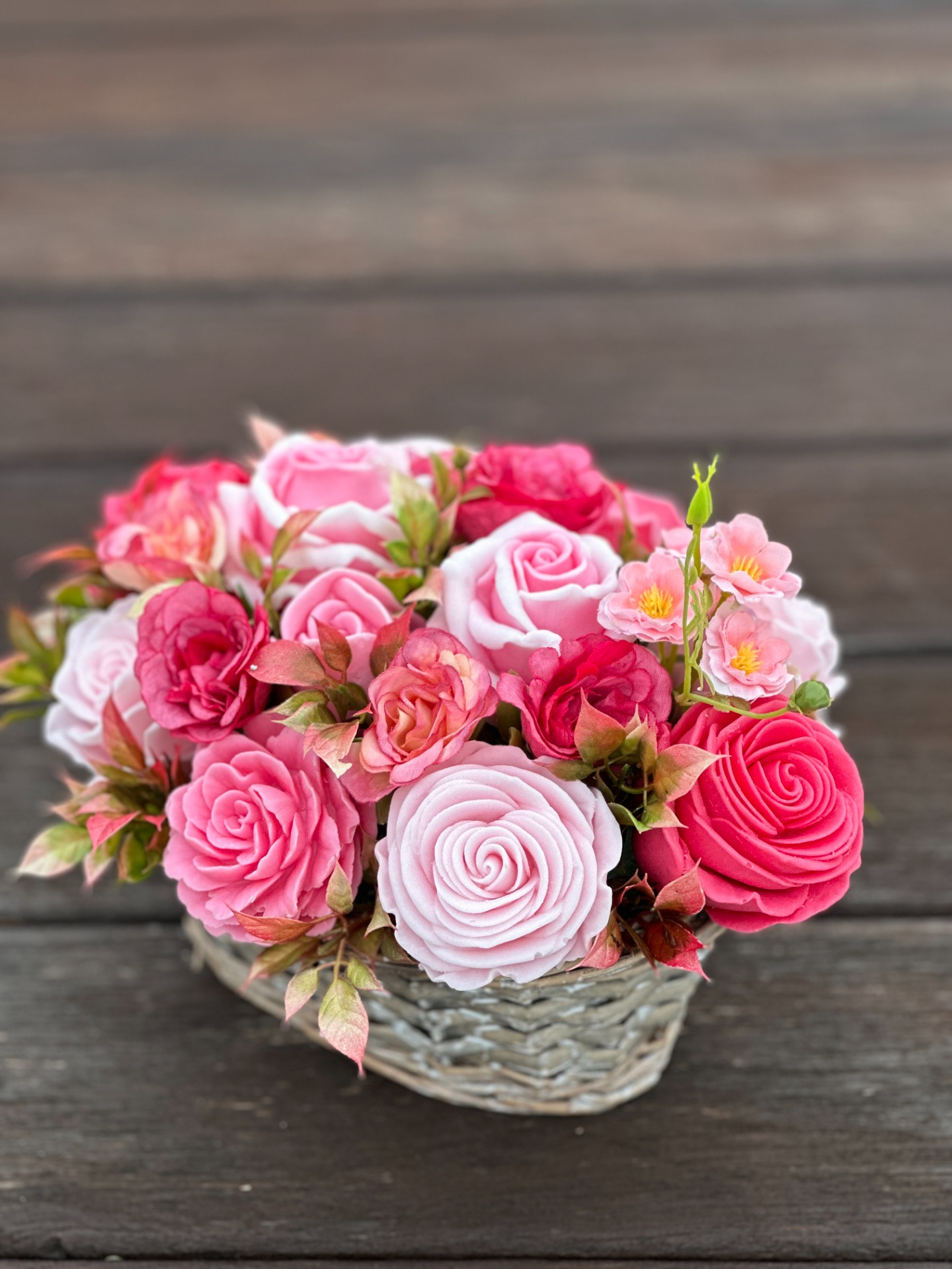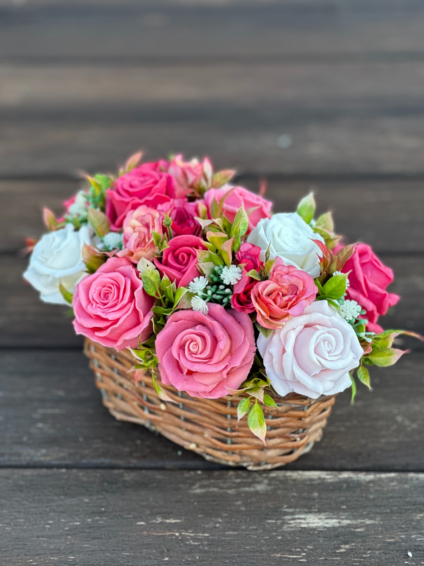 dekorační mýdlová kytice : ručně vyrobené mýdlové květiny s příjemnou květinovou vůní, dodekorováno umělými rostlinami, proutěný obal