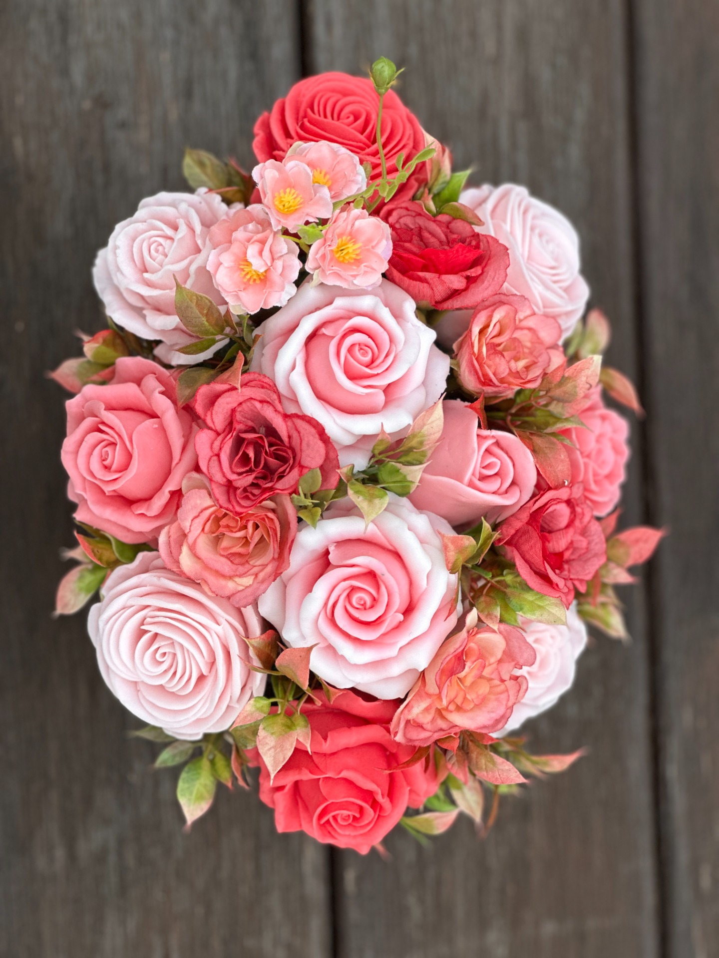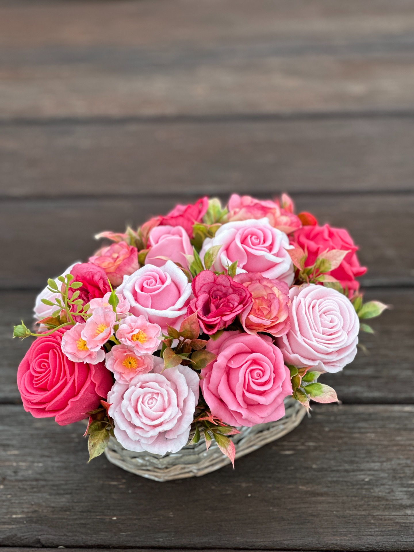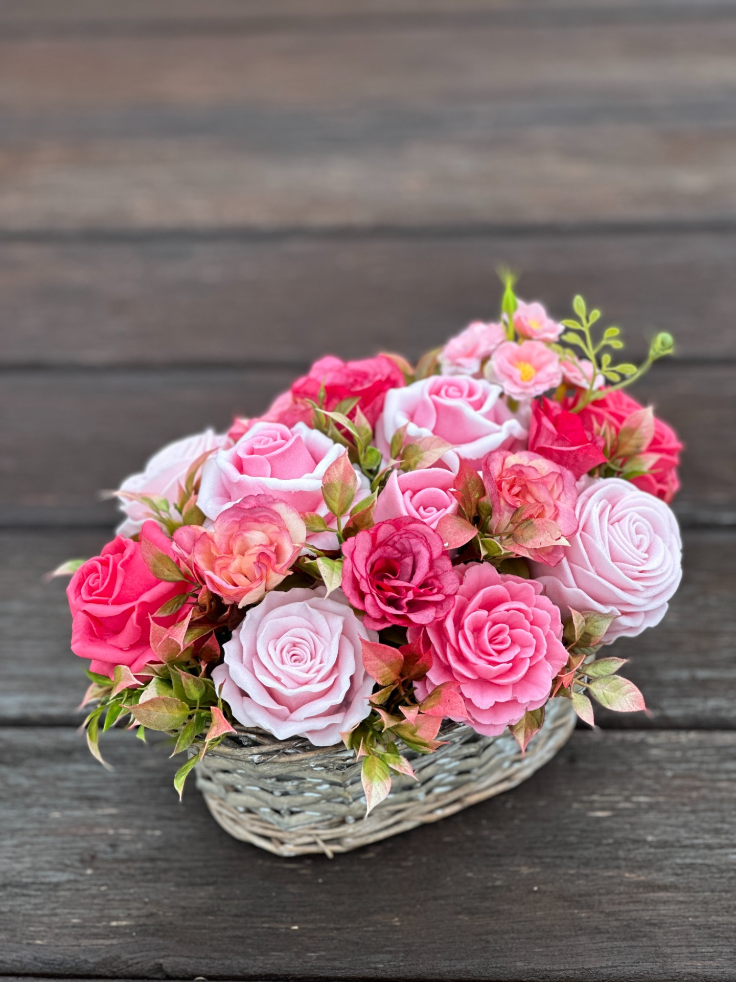 dekorační mýdlová kytice : ručně vyrobené mýdlové květiny s příjemnou květinovou vůní, dodekorováno umělými rostlinami, proutěný obal