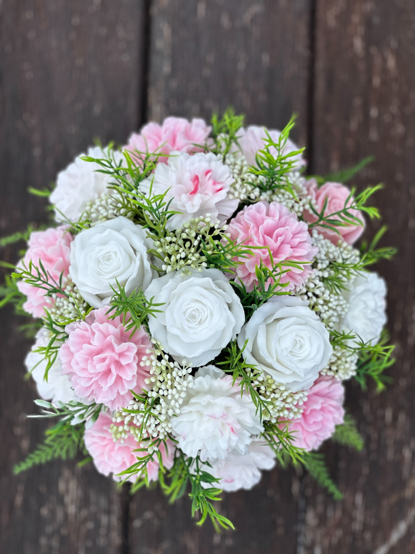 dekorační mýdlová kytice : ručně odlité mýdlové květiny s příjemnou květinovou vůní, dodekorováno umělými rostlinami, v proutěném obalu