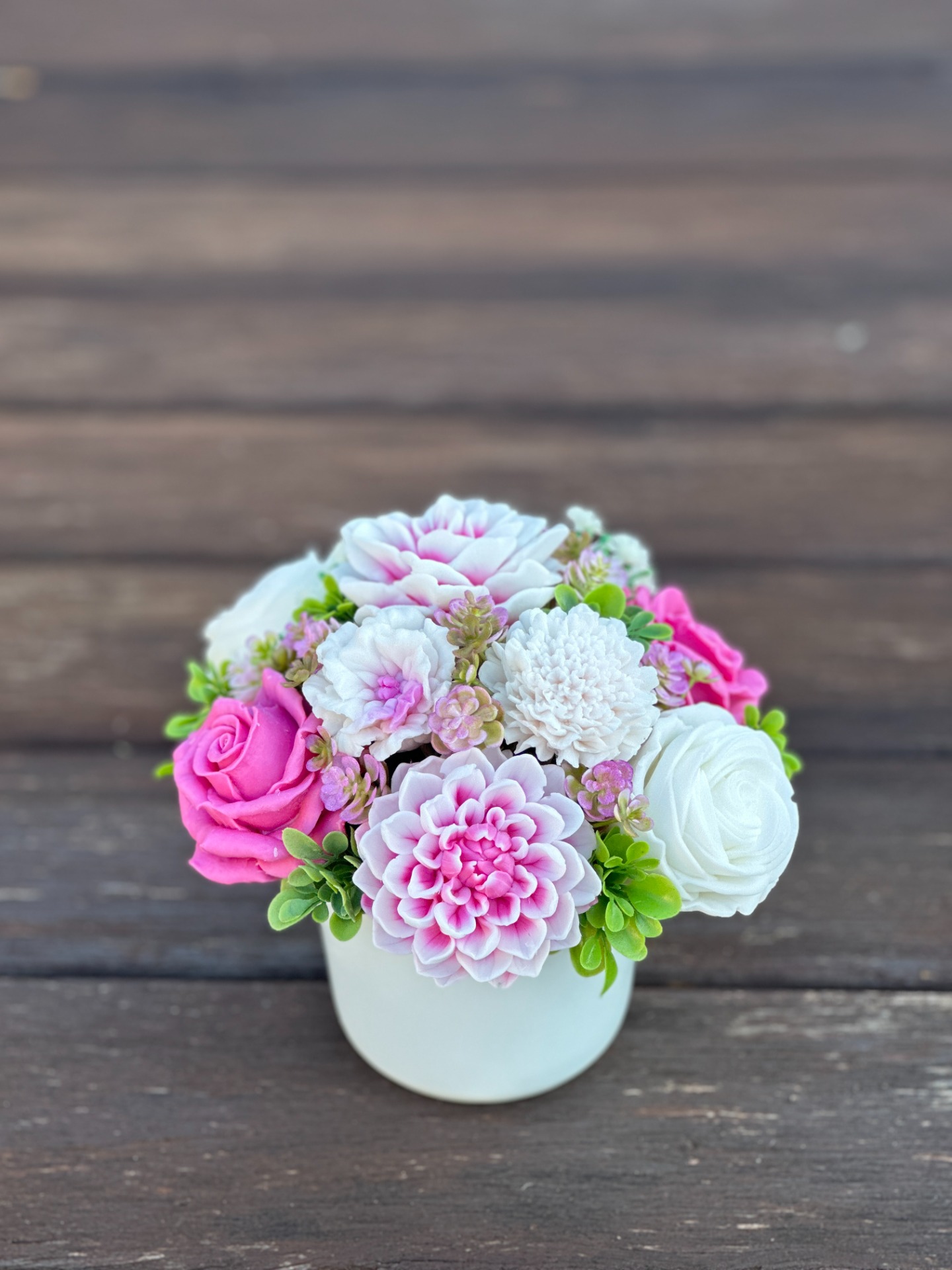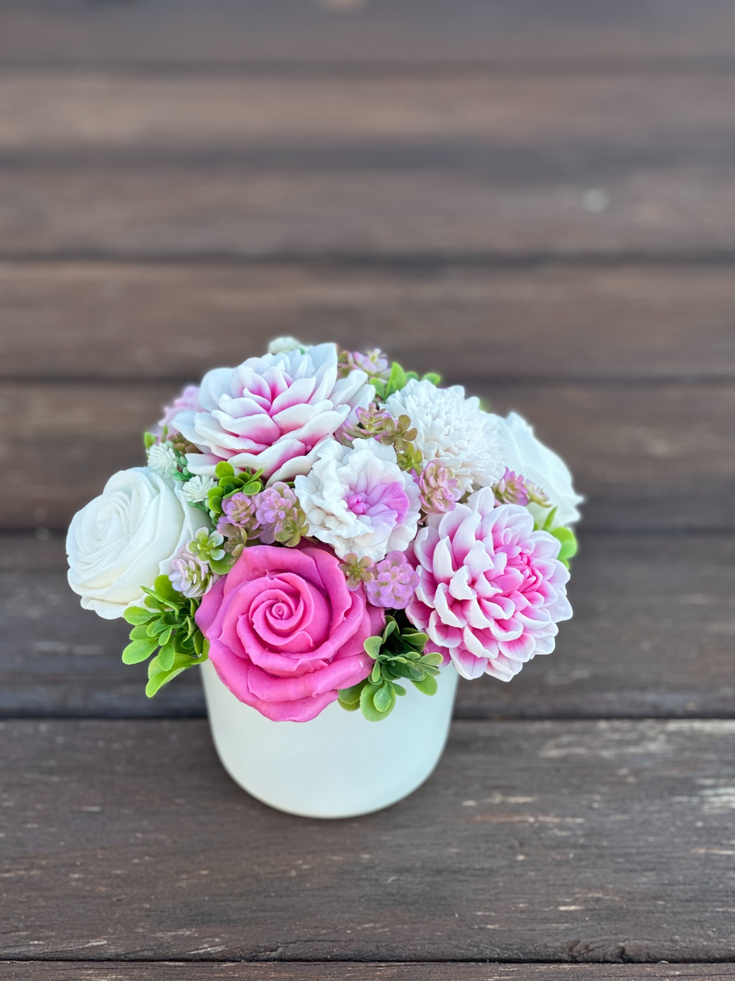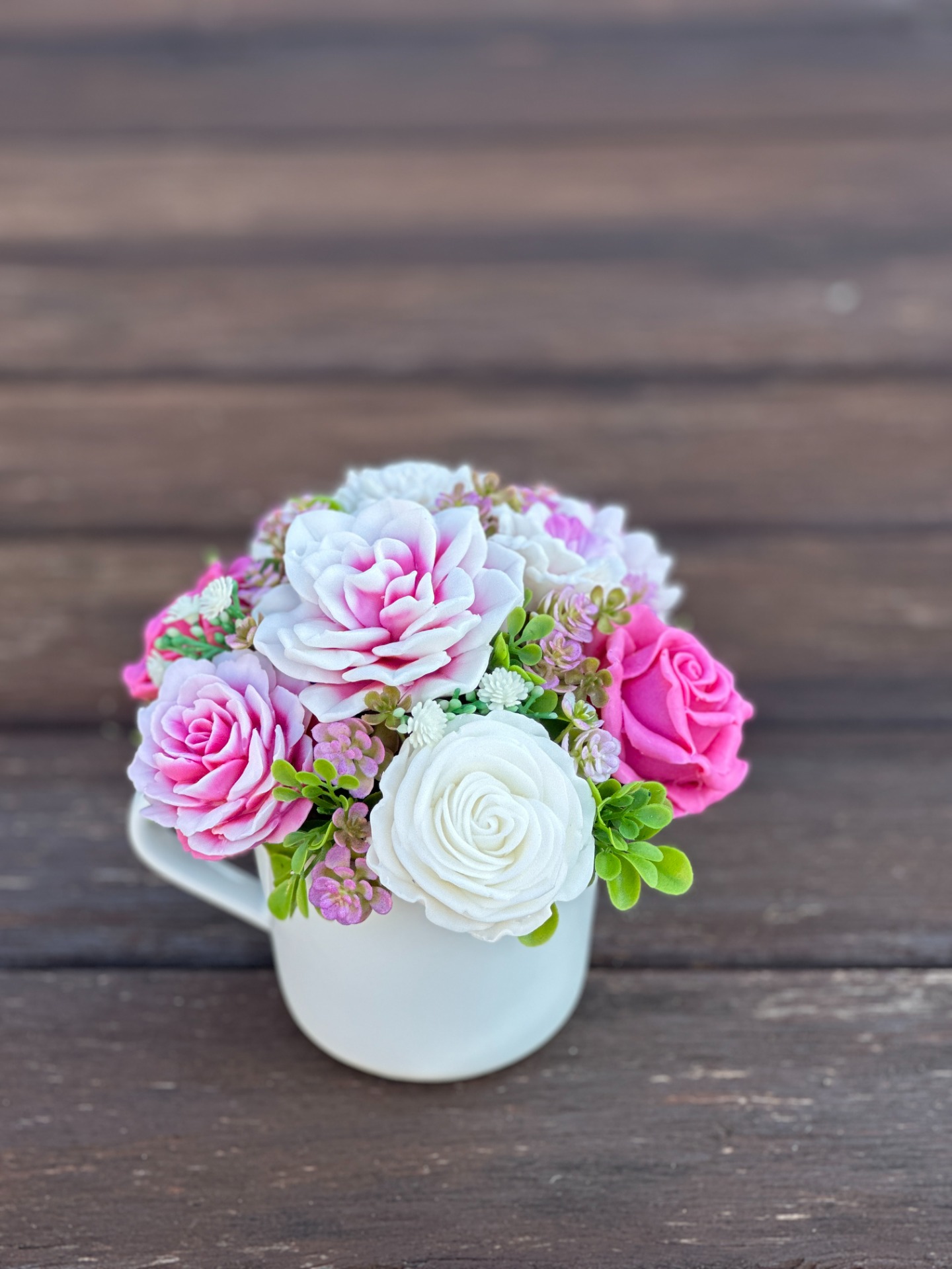 dekorační mýdlová kytice : ručně vyrobené mýdlové květiny s příjemnou květinovou vůní, dodekorováno umělými rostlinami, keramický hrnek