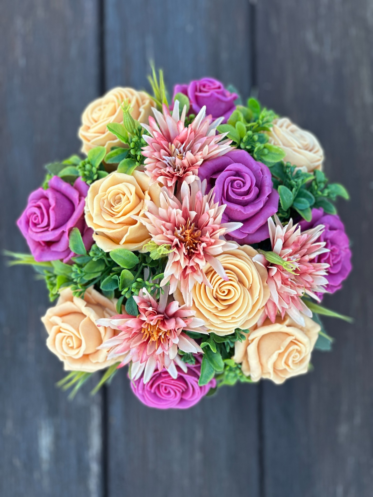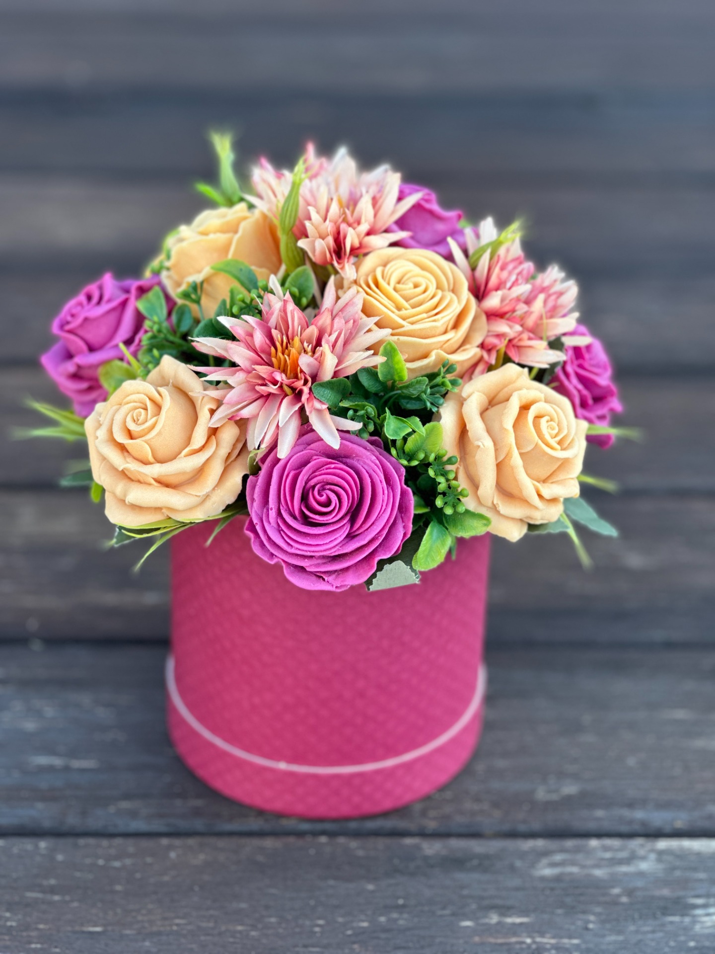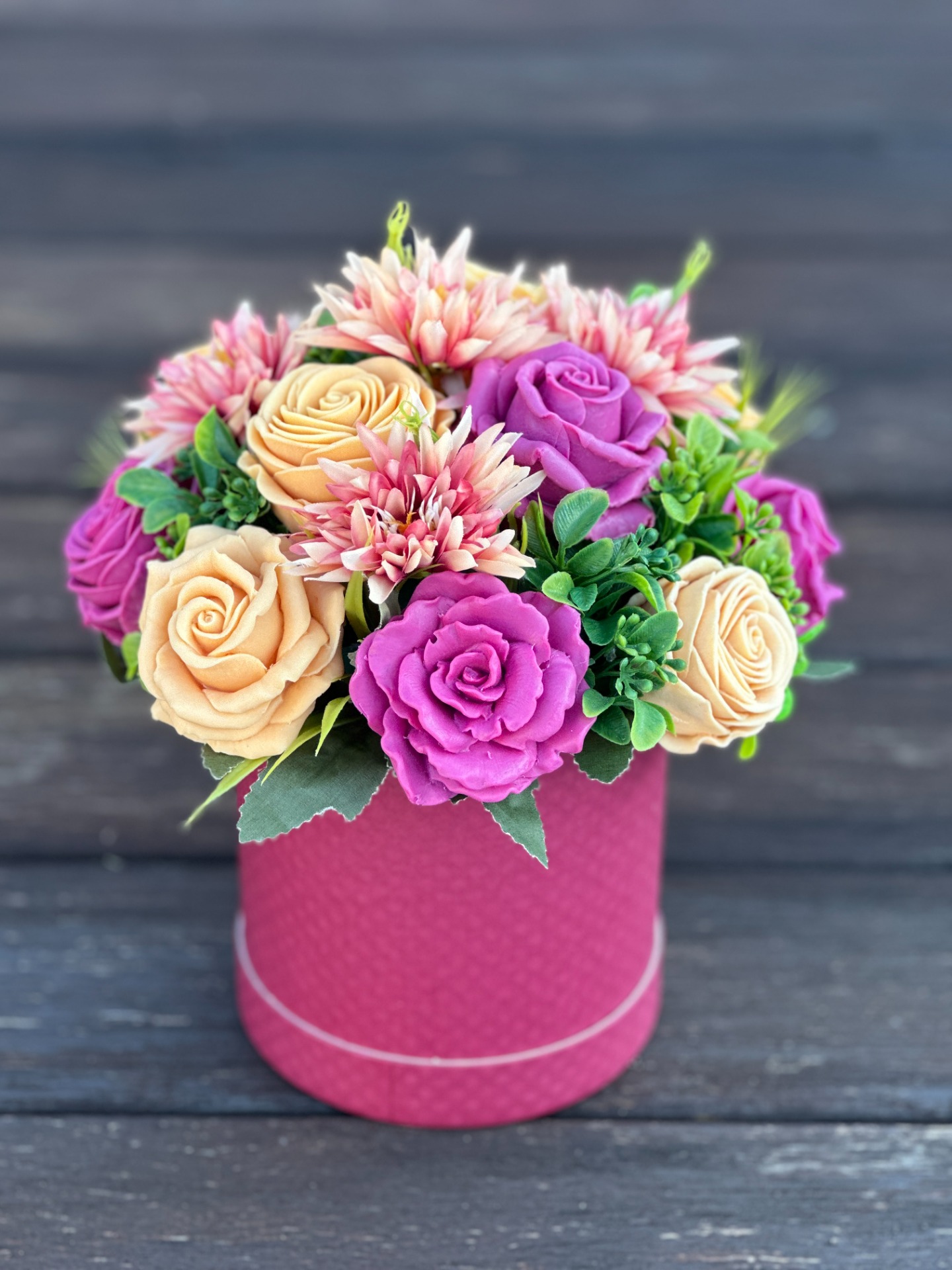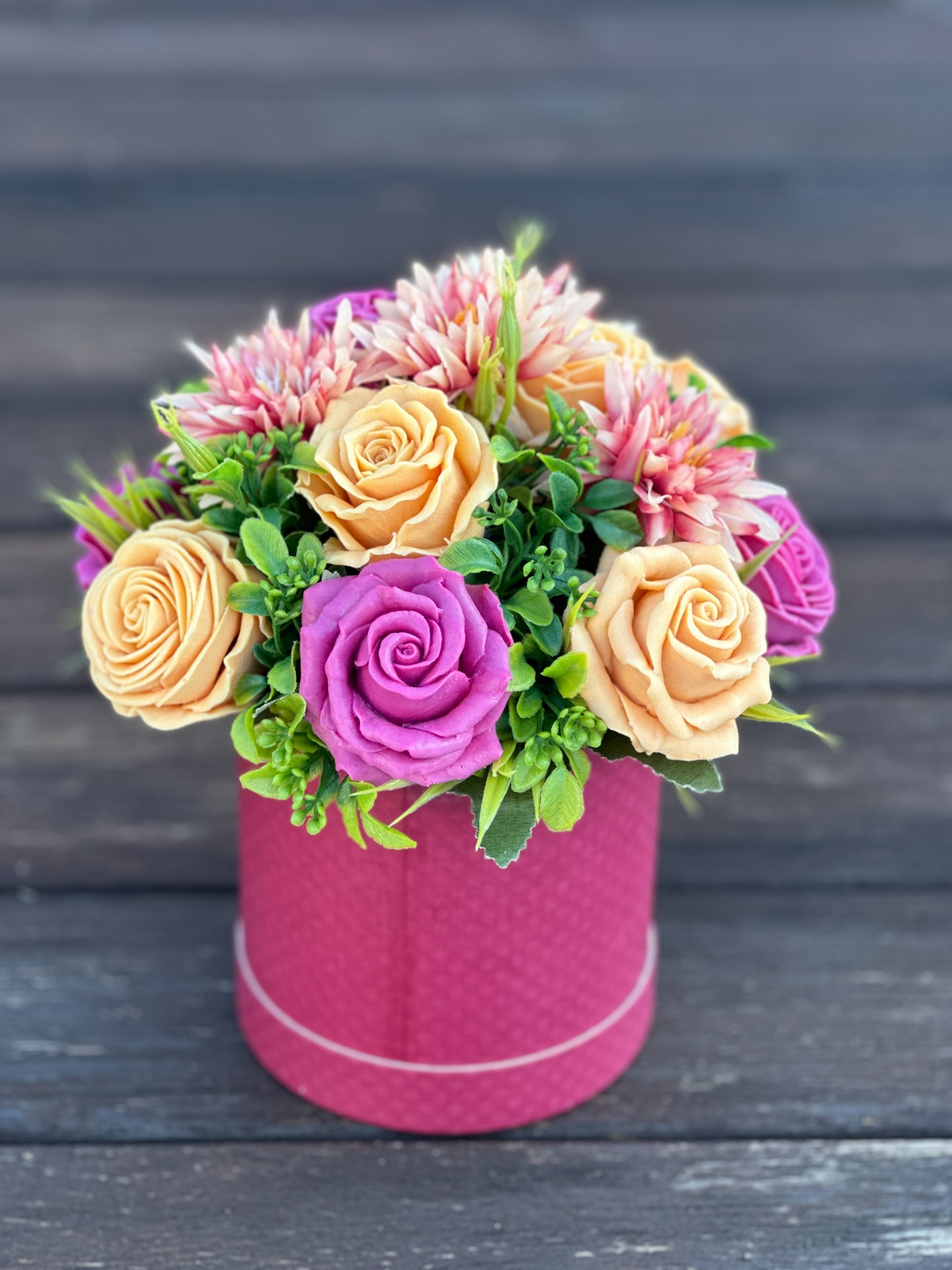 dekorační mýdlová kytice : ručně vyrobené mýdlové květiny s příjemnou květinovou vůní, dodekorováno umělými rostlinami, papírový flower box