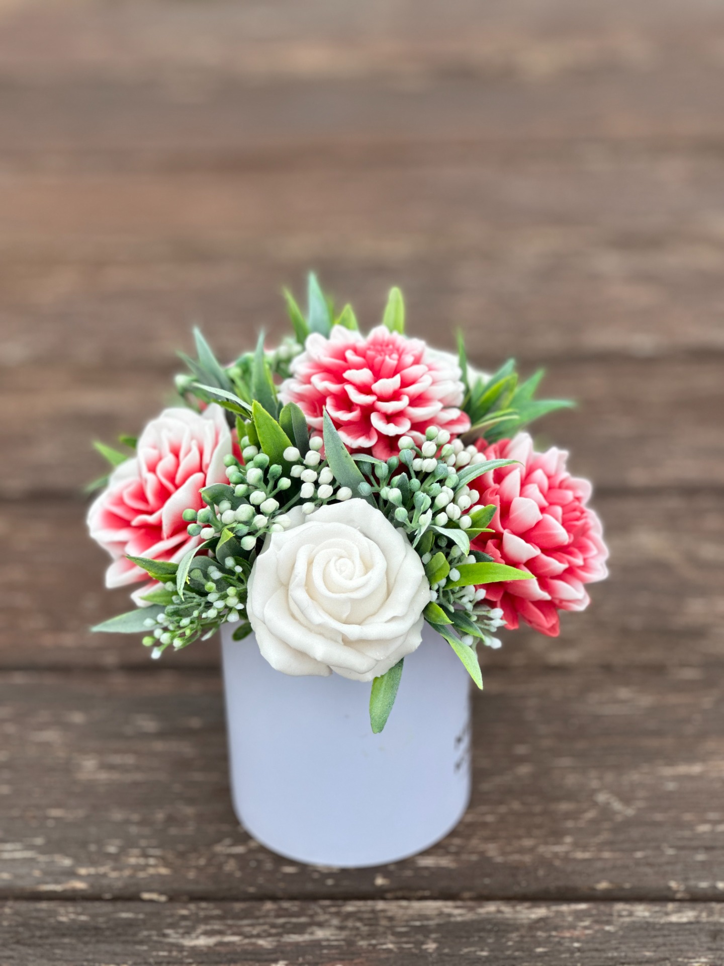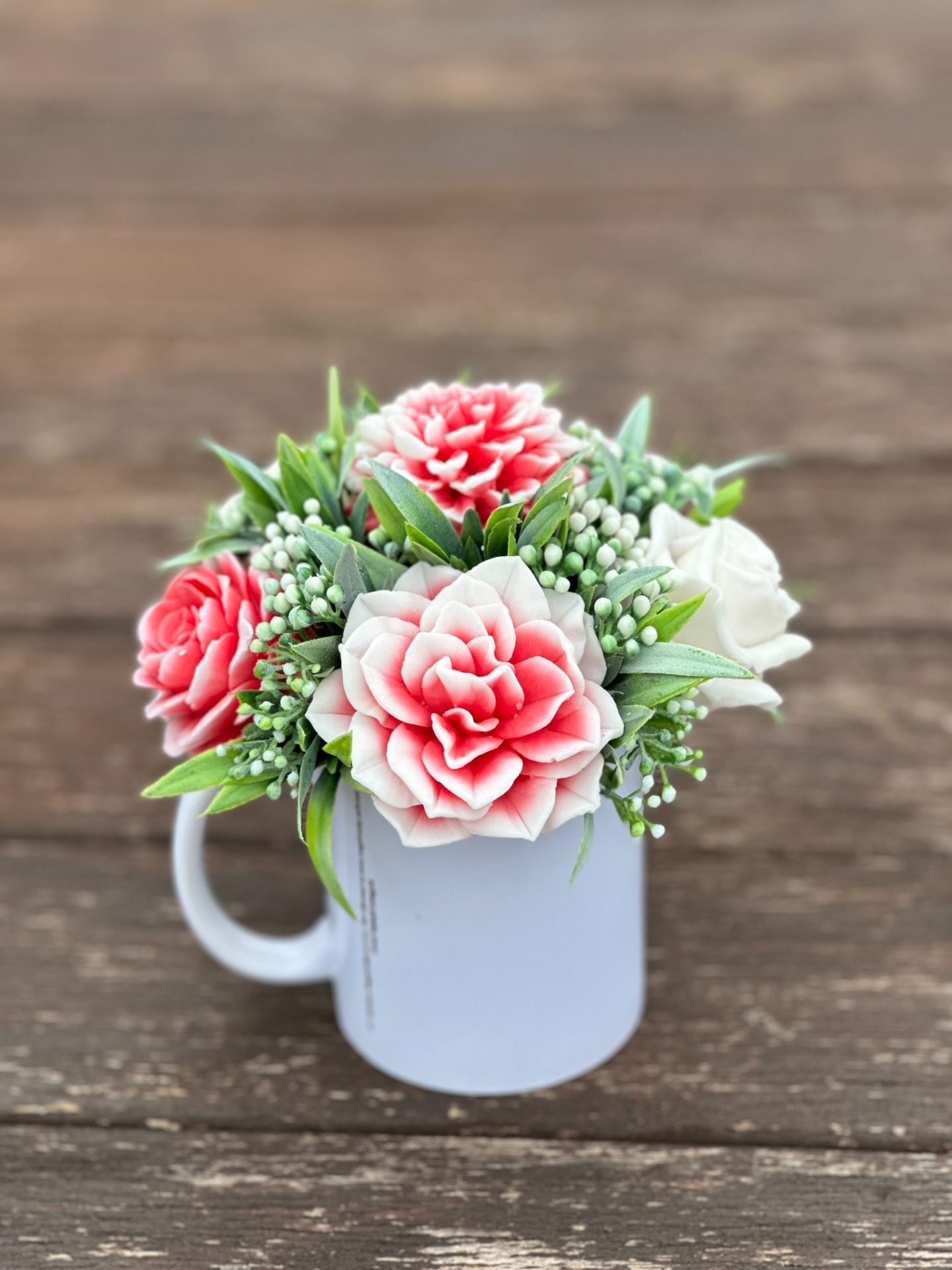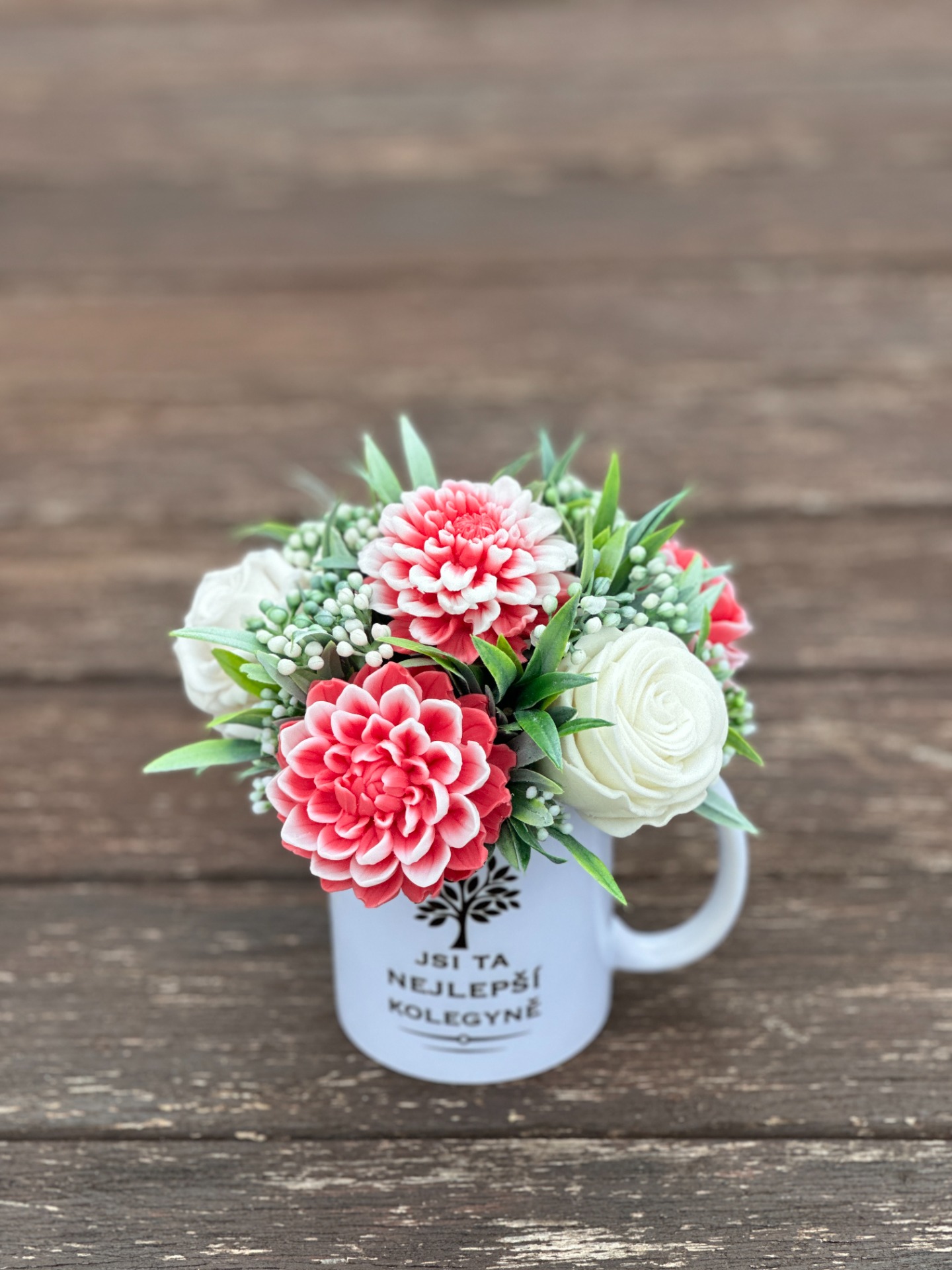 dekorační mýdlová kytice : ručně vyrobené mýdlové květiny s příjemnou květinovou vůní, keramický hrnek, dodekorováno umělými rostlinami