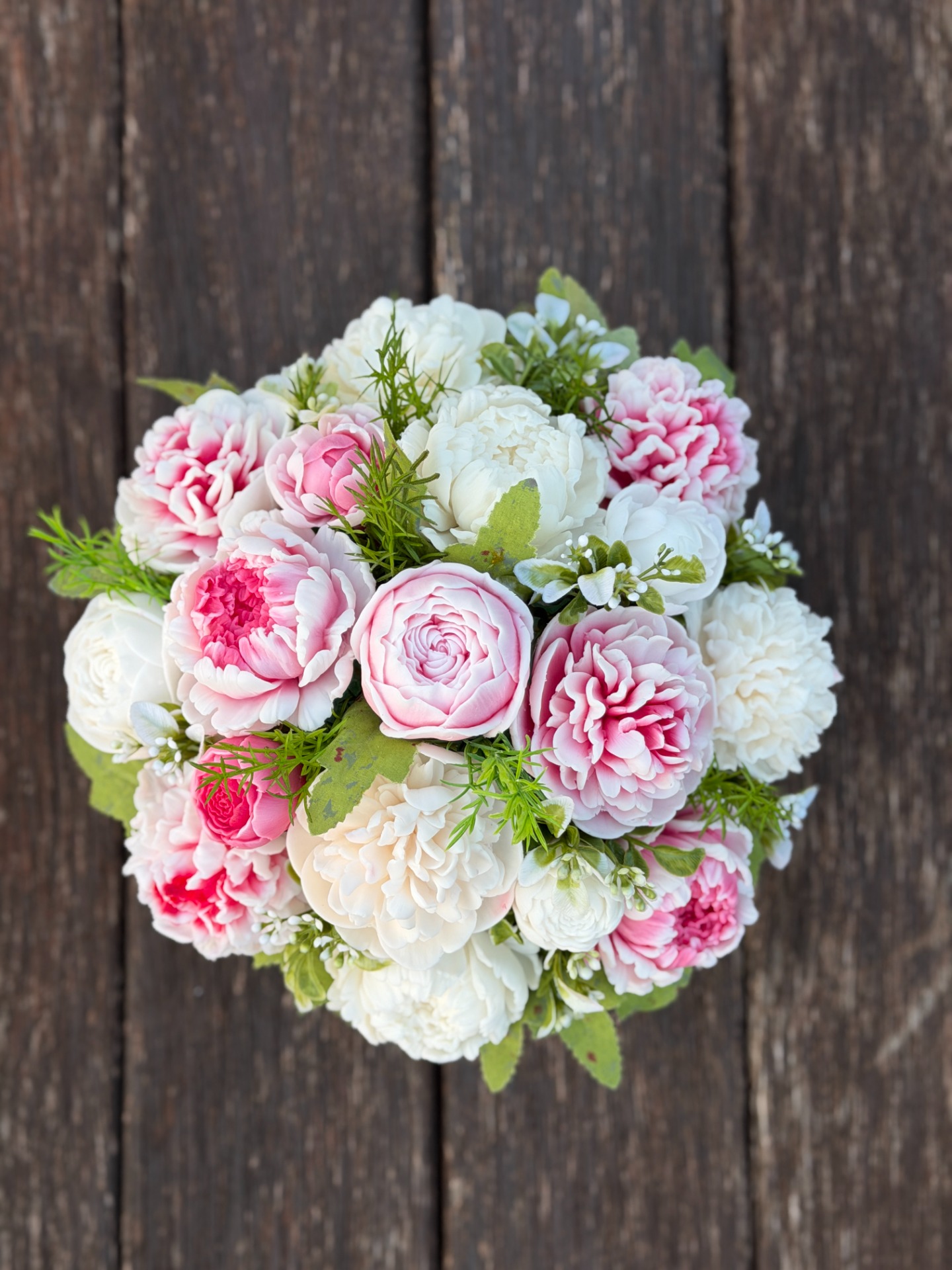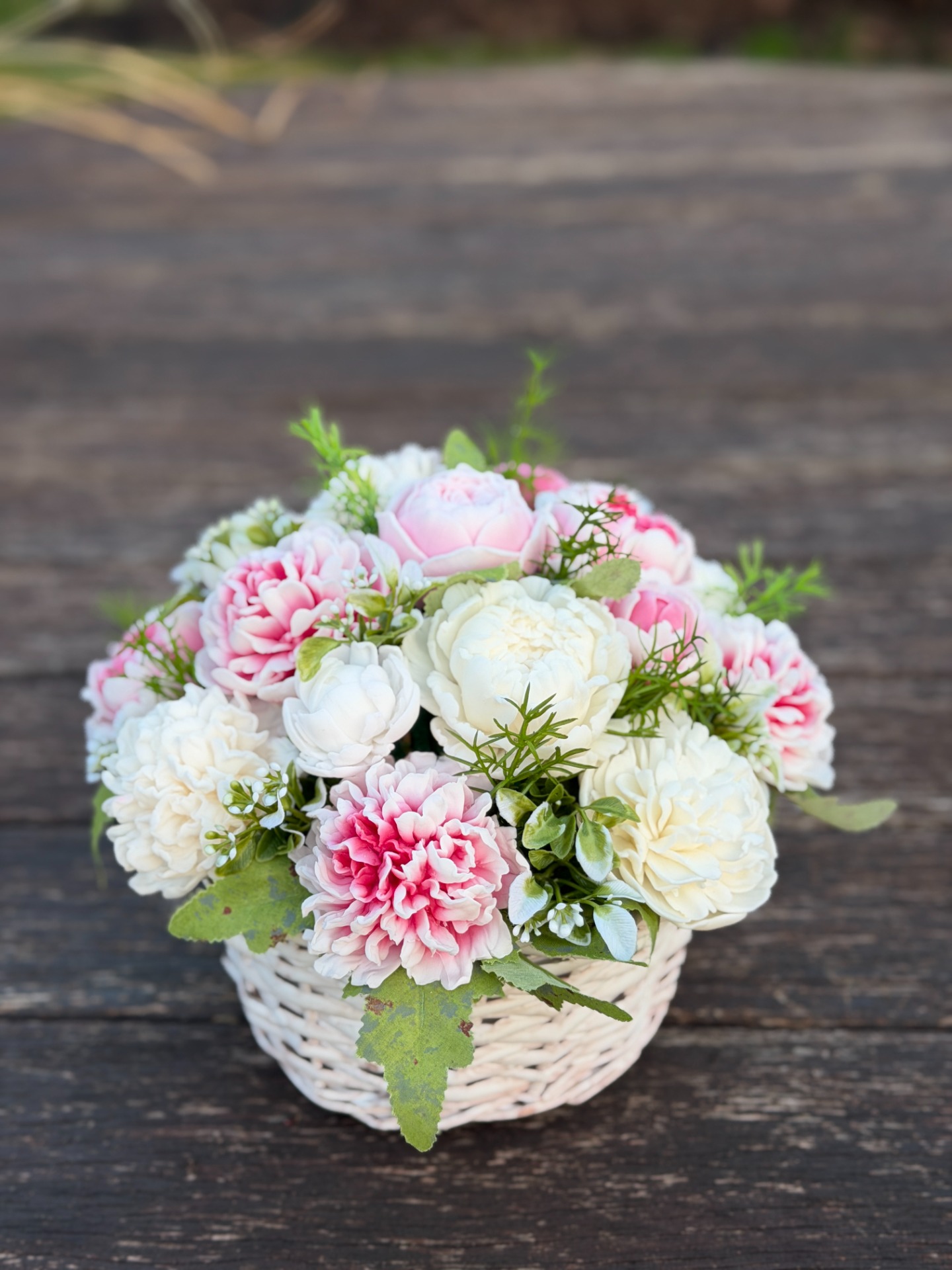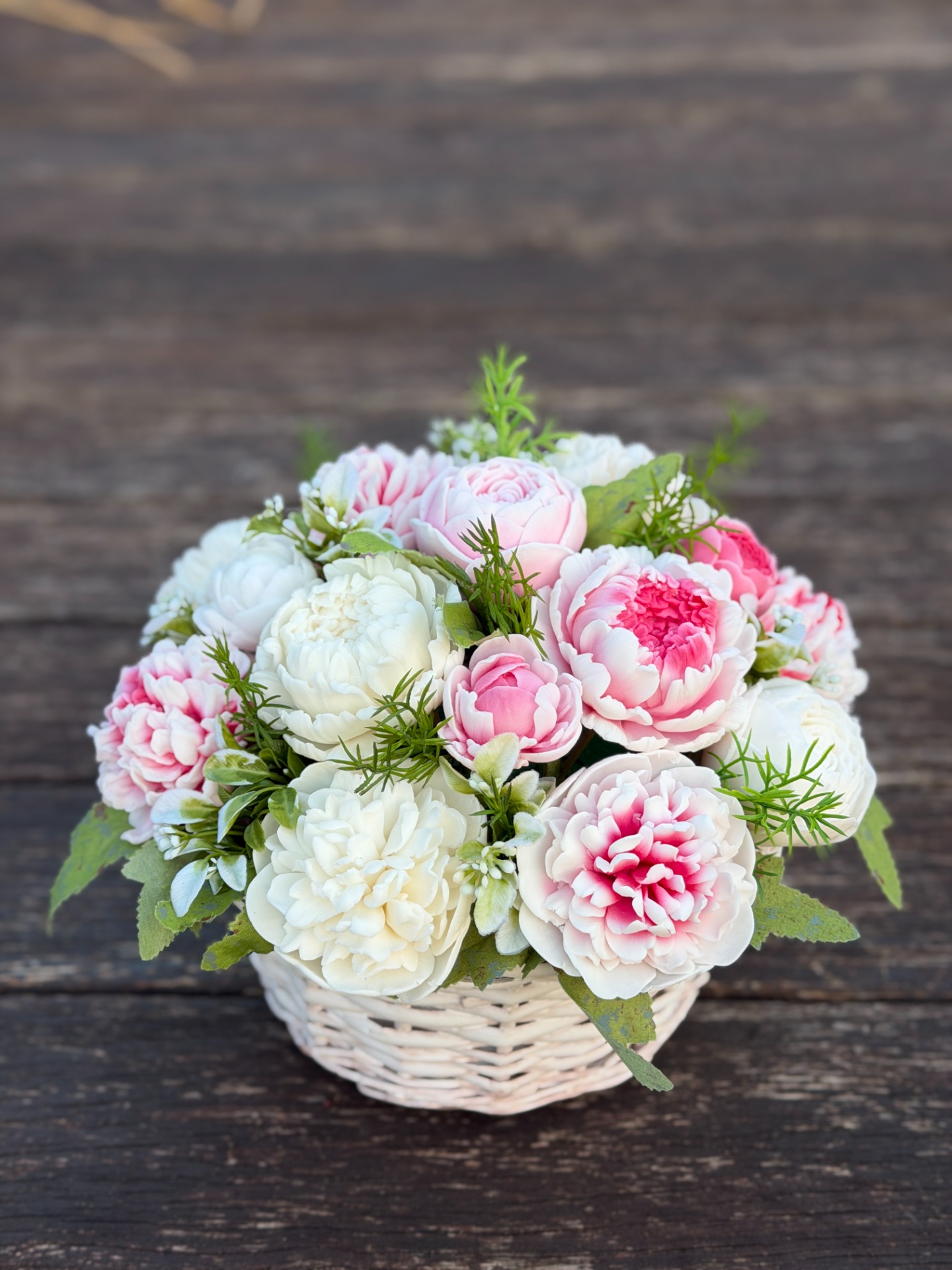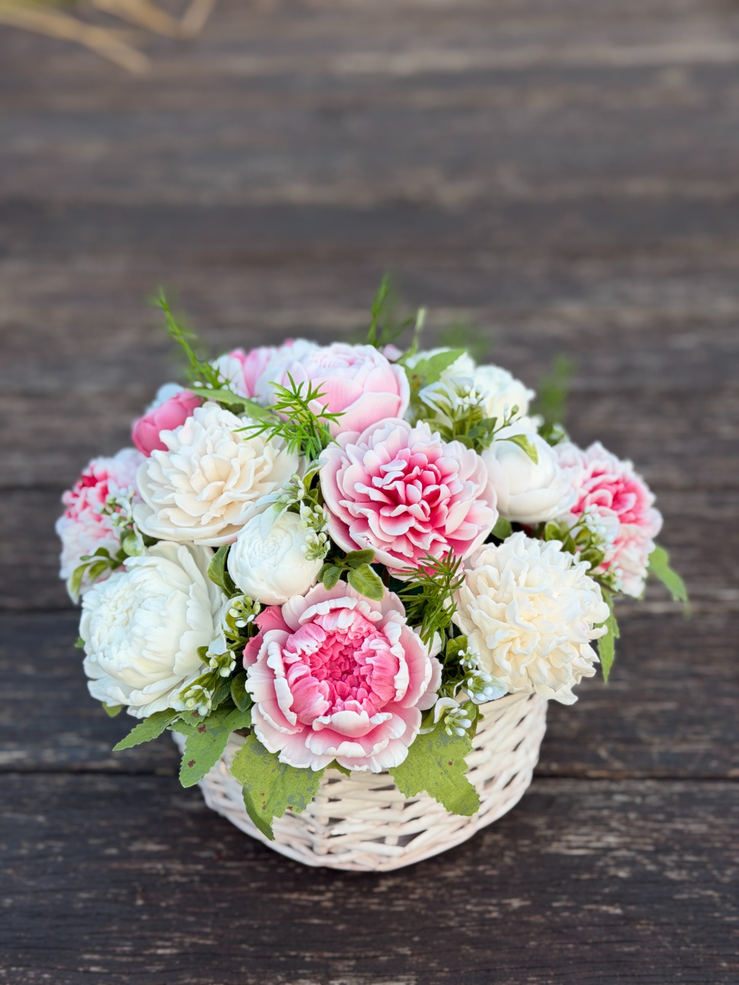 dekorační mýdlová kytice : ručně vyrobené mýdlové květiny s příjemnou květinovou vůní, dodekorováno umělými rostlinami, proutěný obal