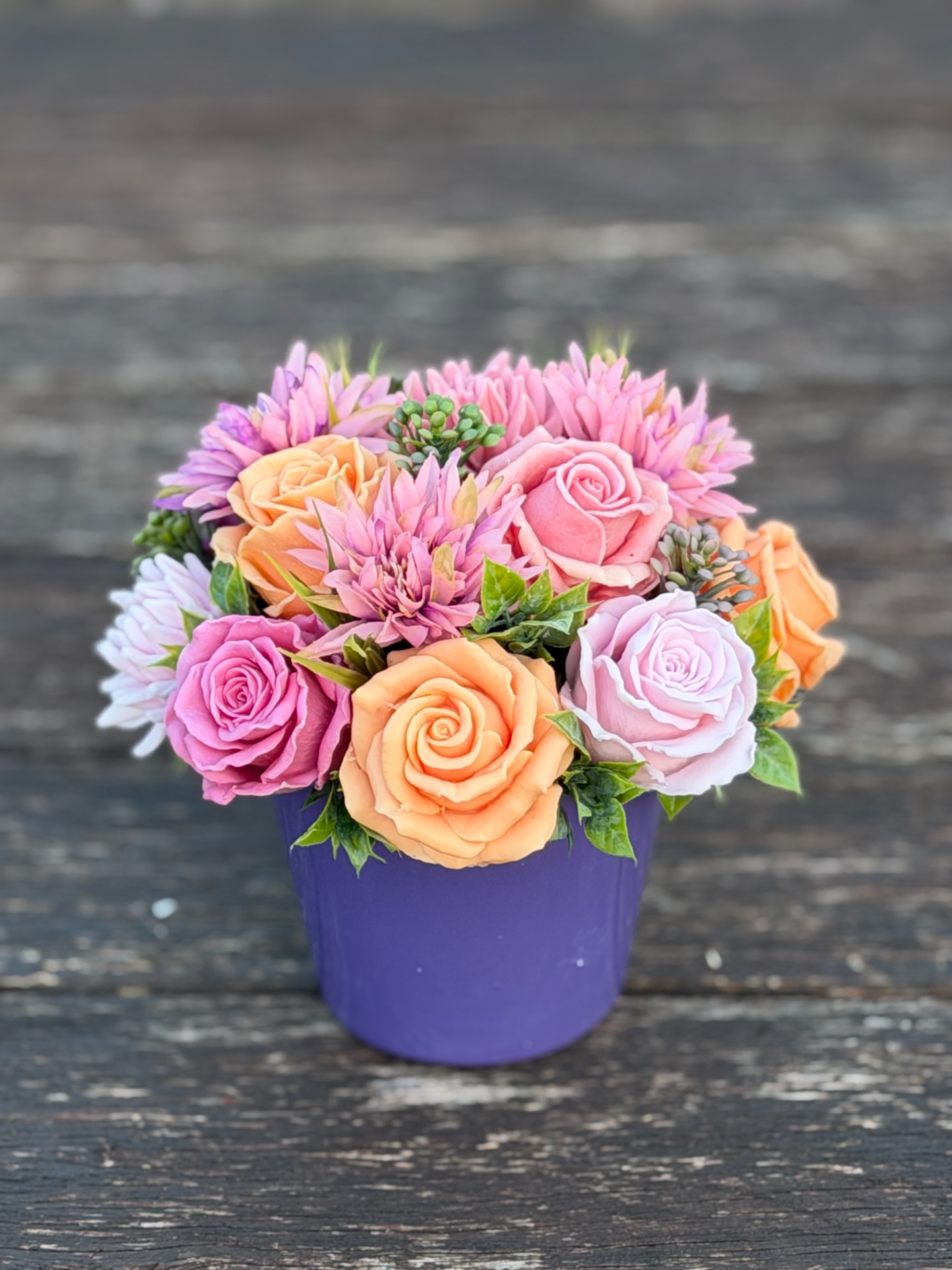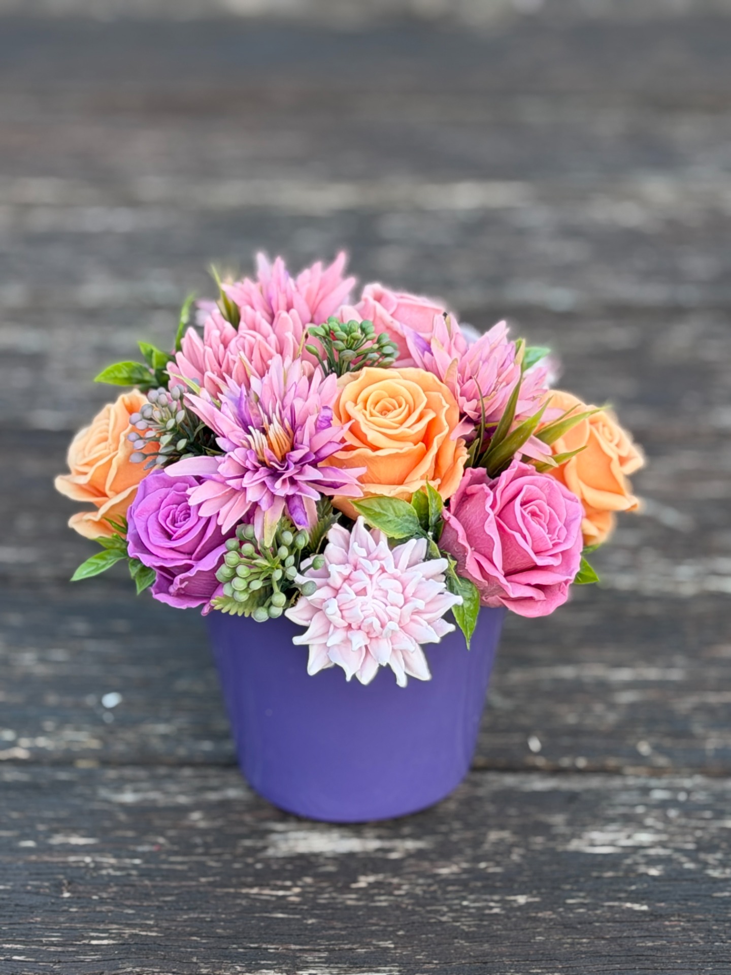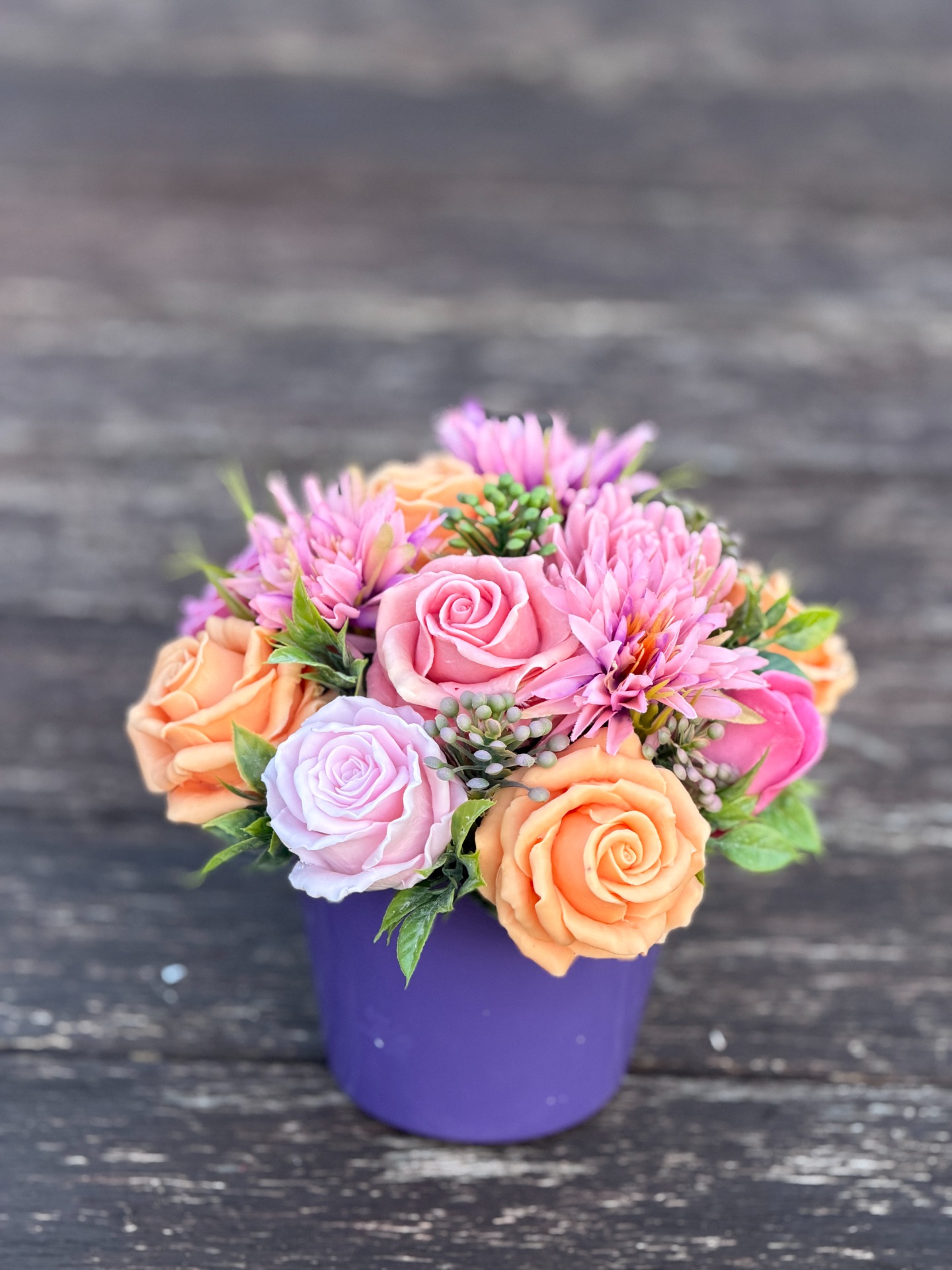 dekorační mýdlová kytice : ručně vyrobené mýdlové květiny s příjemnou květinovou vůní, dodekorováno umělými rostlinami, keramický obal