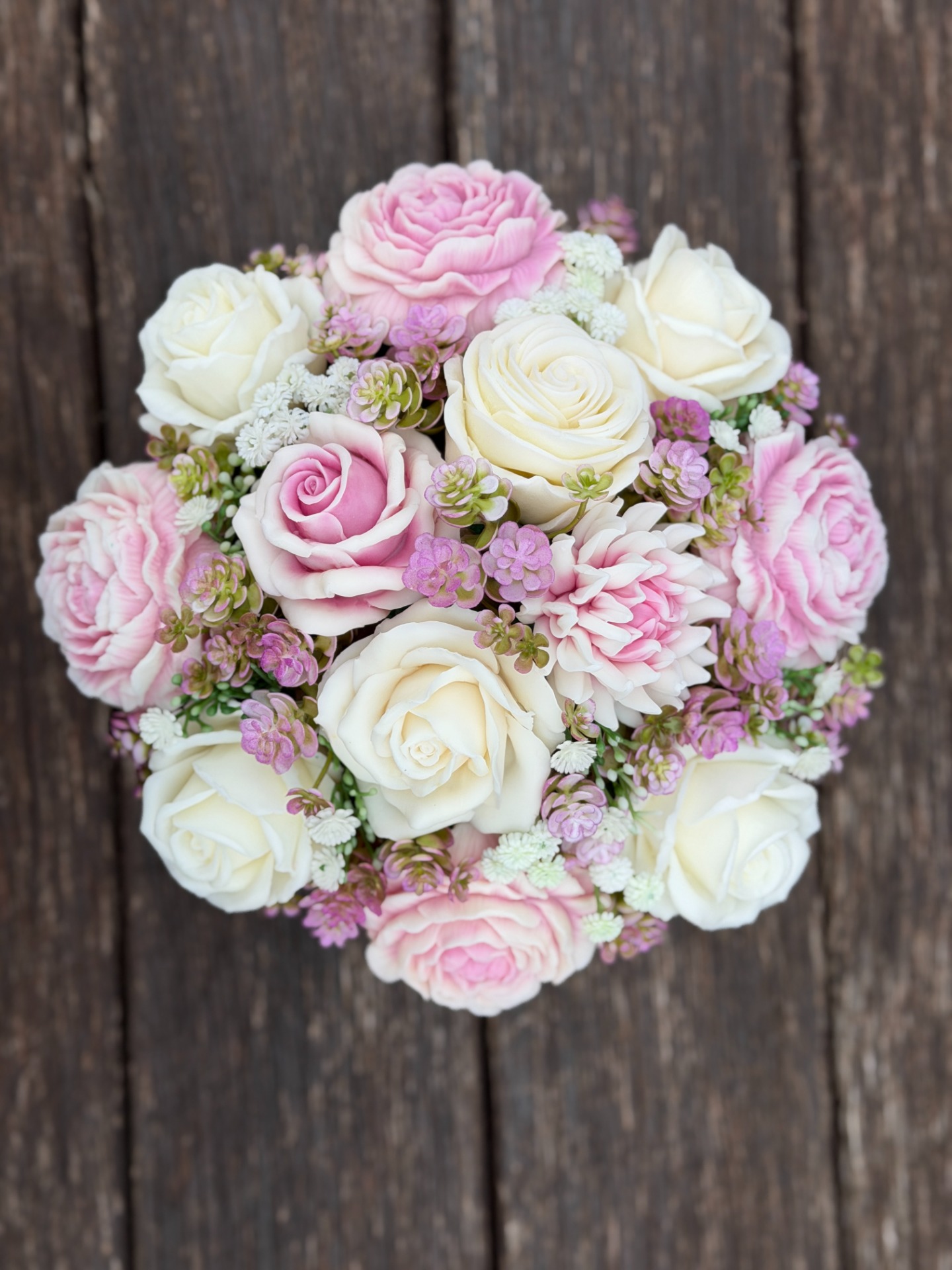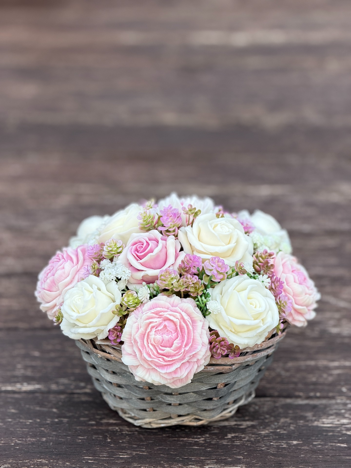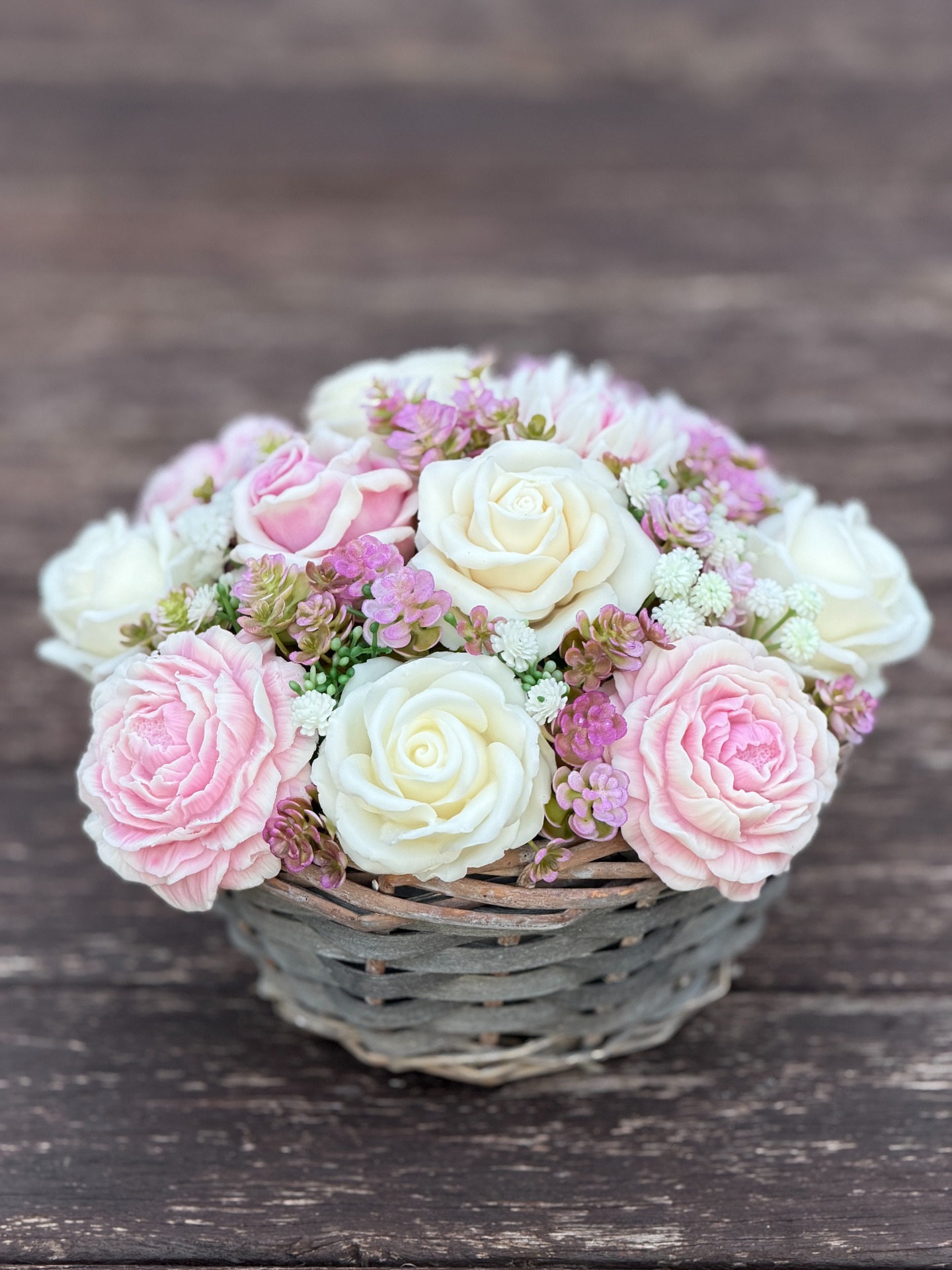 dekorační mýdlová kytice - ručně vyrobené mýdlové květiny s příjemnou květinovou vůní, proutěný obal, dodekorováno umělými rostlinami